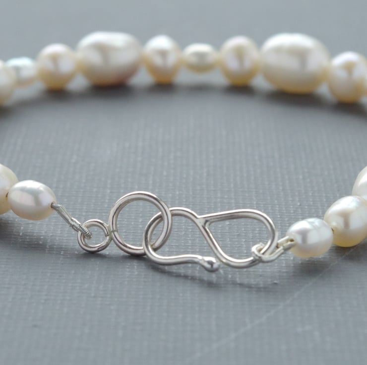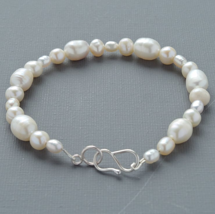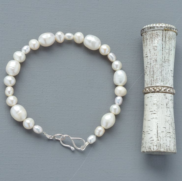 A classic Freshwater Pearl bracelet, made with irregular sizes and shapes of lustrous real pearls for a bohemian look. The timeless appeal of real pearls arranged in an innovative way perfect for brides, formal occasions, or just because. Fastened with a sterling silver clasp, forged by me at my home in West Sussex and presented in a gift box tied with a bow. The advantage of the hook clasp is that it can be securely fastened without any assistance, so you can wear your bracelet all of the time! The internal diameter is 175 mm or 7" and will easily fit most wrists. The final photograph shows the bracelet next to a vintage lipstick case measuring 75 mm or 3" to give a sense of scale.