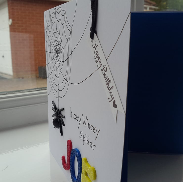 A completely handmade and uniquely designed card. Consisting of quality pristine white card which has a spiders web hand drawn in black ink with a black plastic spider dangling. The words incey wincey spider and a happy birthday tag with black ribbon . Personalised with child's name with glittered foam letters.