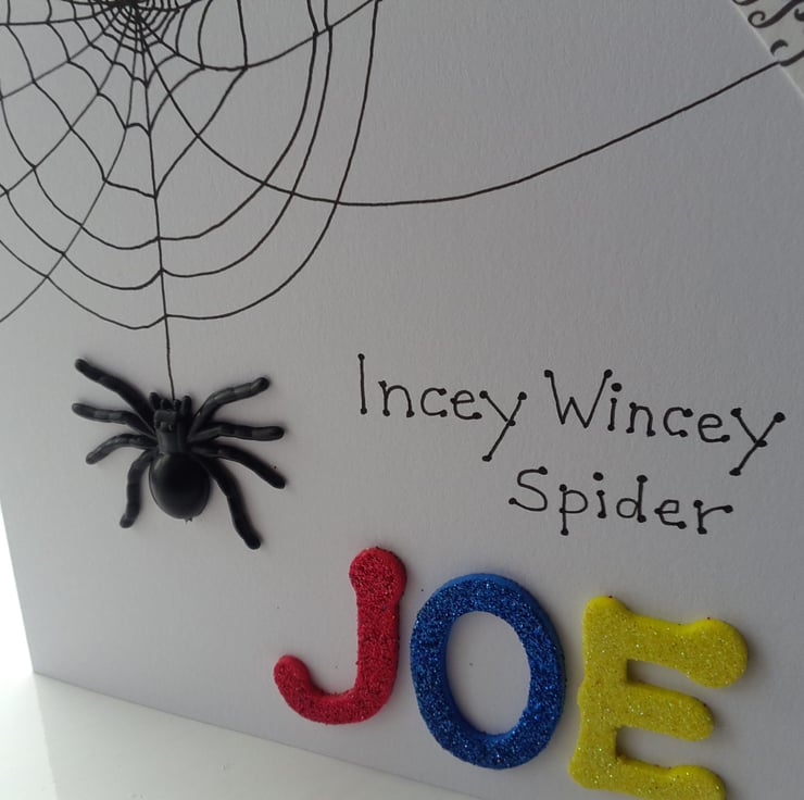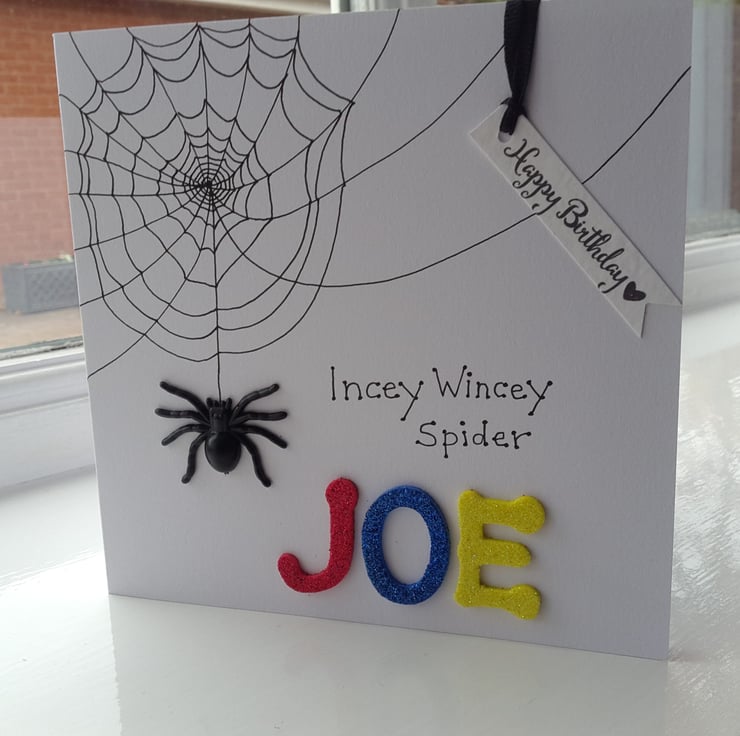 A completely handmade and uniquely designed card. Consisting of quality pristine white card which has a spiders web hand drawn in black ink with a black plastic spider dangling. The words incey wincey spider and a happy birthday tag with black ribbon . Personalised with child's name with glittered foam letters.