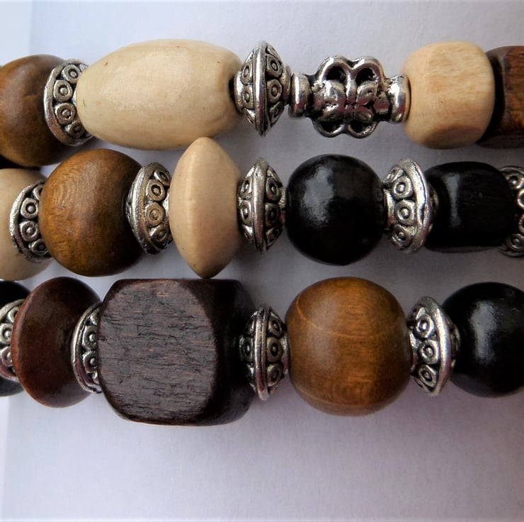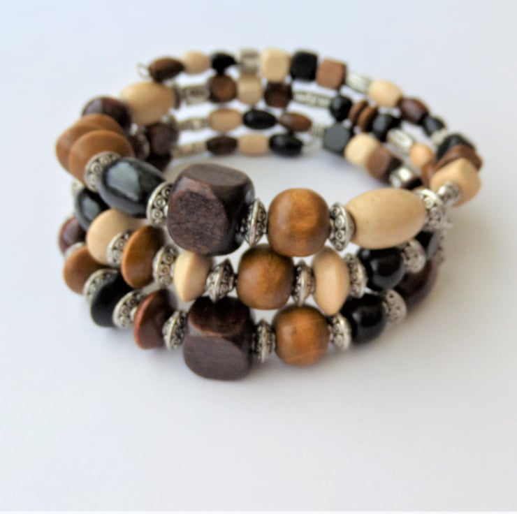 Memory wire bracelet made using mixed colour and sized wood beads and Tibetan silver beads. Approx 3 coils.