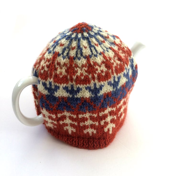 The tea cosy has been knitted in a fair isle stitch depicting leaves and flowers in a orange , blue and cream