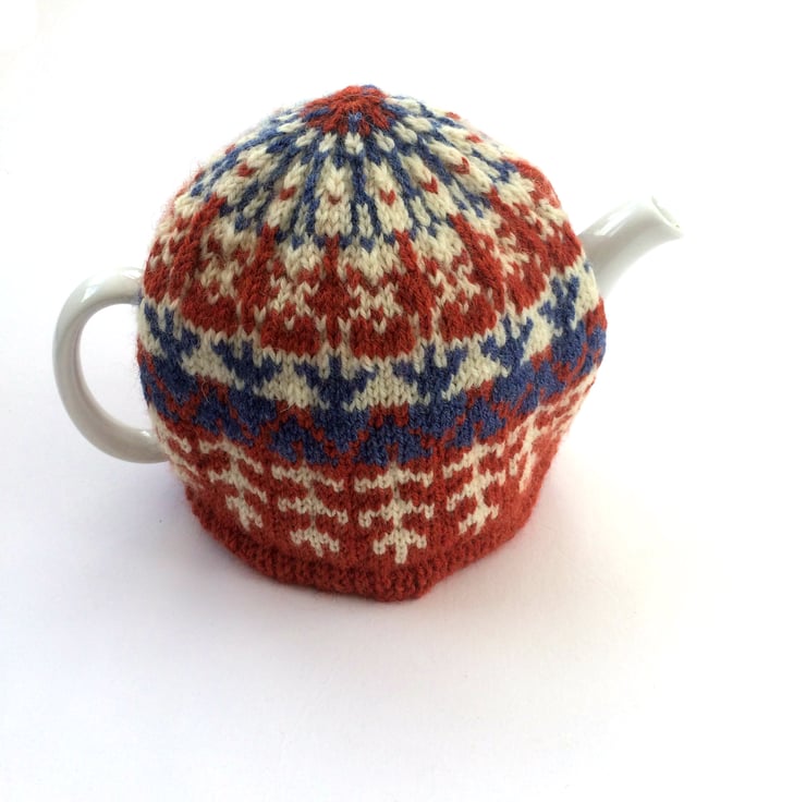 Knitted Fair Isle tea cosy . Wool Tea Pot Cover, hand knitted stranded colourwork in bright colourful colours!, great kitchen decoration and or gift