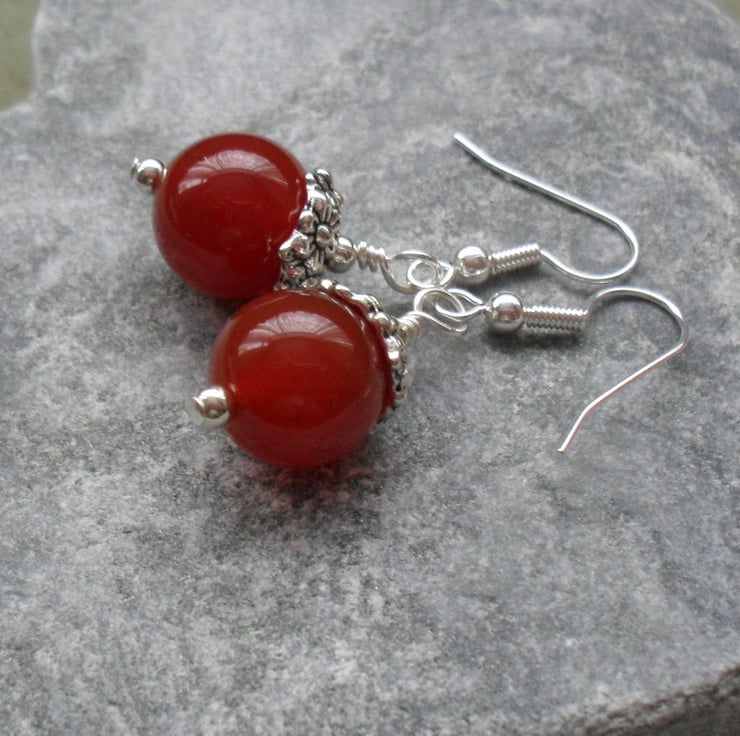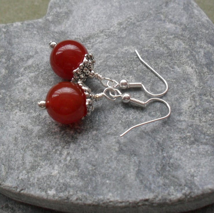 Deep orange agate beads with silver tone bead caps with a flower pattern are attached to silver plated ear wires