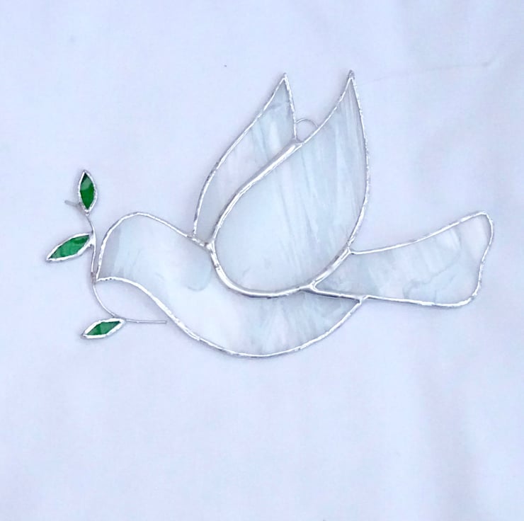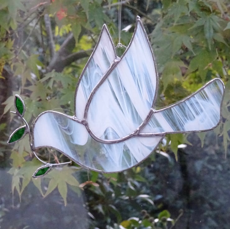 This peace dove has been made from streaky white and clear stained glass with green stained glass for the leaves.