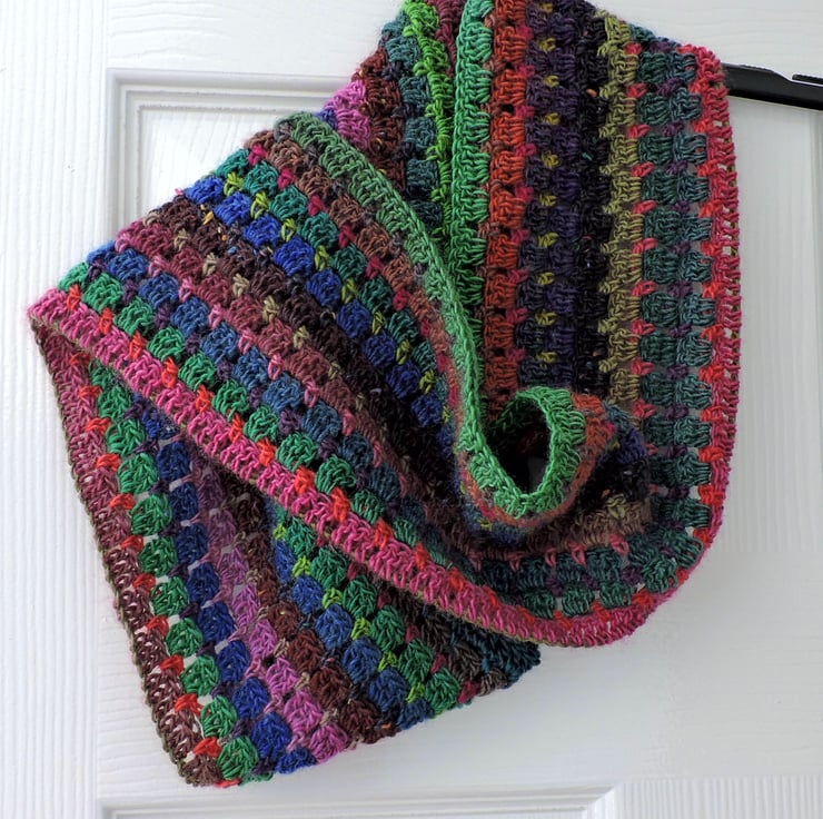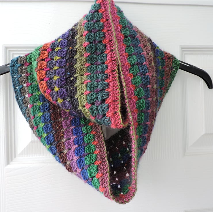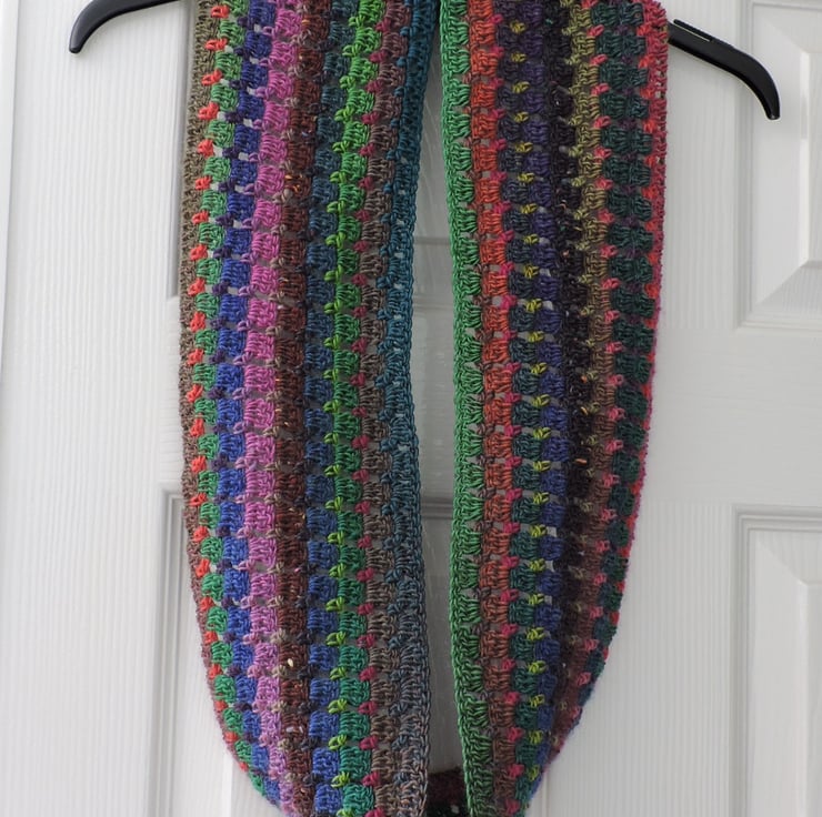 A colourful crochet infinity scarf for which I've used a double knit acrylic and wool blend multi tonal yarn. This yarn graduates through the colours of pink, blues, greens, charcoal, paprika and mauve.