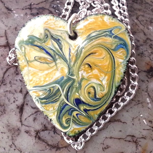I have made the pendant by first building a base of white enamel on the copper shape. I added a coat of yellow over the white then scattered blue-green enamel on this and then, while the piece was at red hot in the kiln, I drew through the surface with a steel point to create the unique, random pattern.