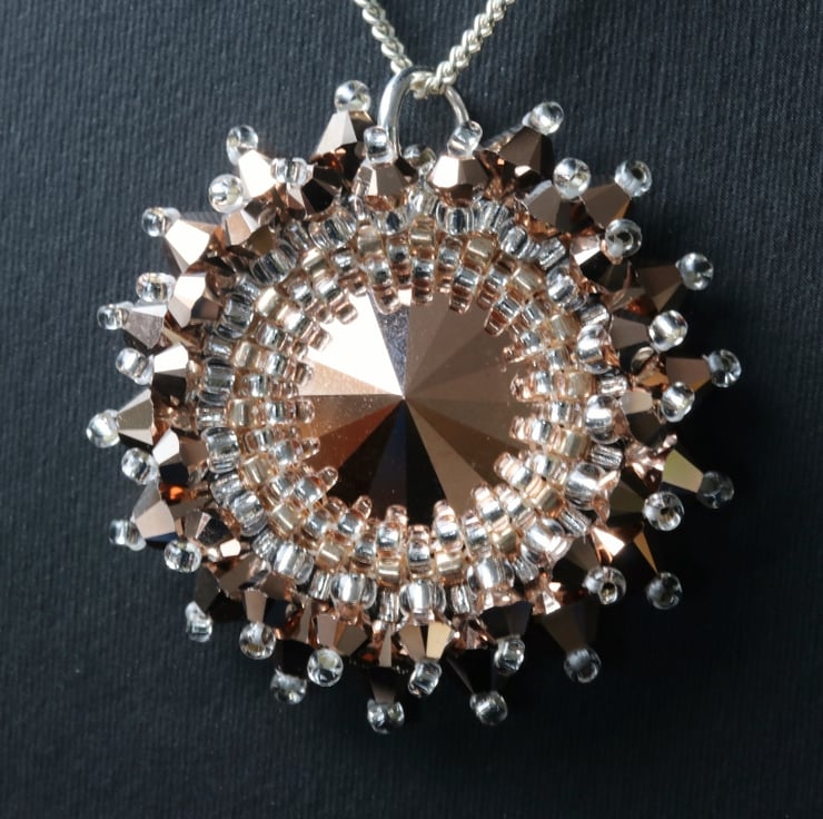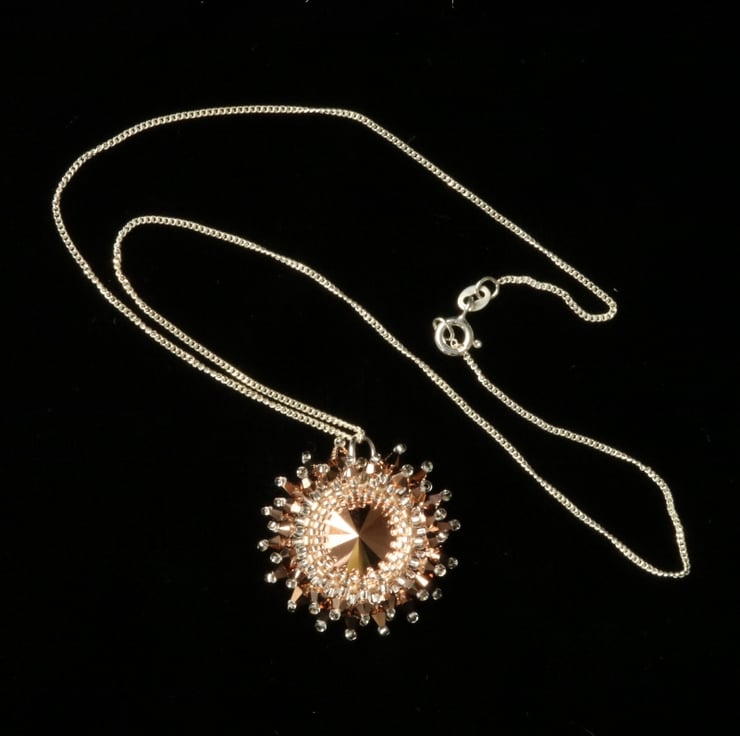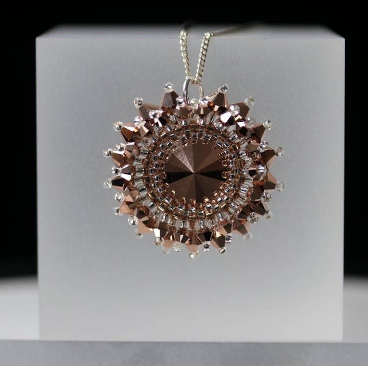 This very sparkly little pendant is in Crystal Rose Gold colour; a shiny, very slightly pinkish, gold. Thirty-five Swarovski crystal bicones have been stitched in two layers around a matching Swarovski rivoli to give a starburst effect. The rivoli makes a striking centerpiece as its faceted pointed shape reflects the surround of tiny seed beads. The piece is strung on a very fine 40.6cms (16ins) sterling silver curb chain with a matching bolt ring clasp. This could be exchanged for a longer or shorter chain if required although, depending on the length you require, this could delay me sending you the piece for a few days. An 18inch chain would cost the same, but there may be a small extra cost for a longer one so please let me know before purchasing if you would like this option.