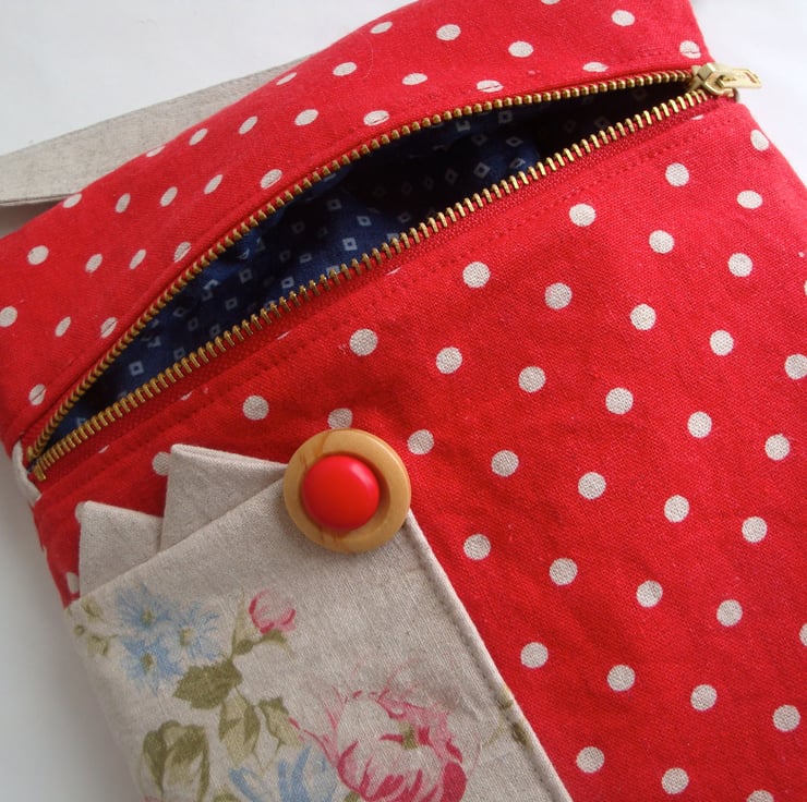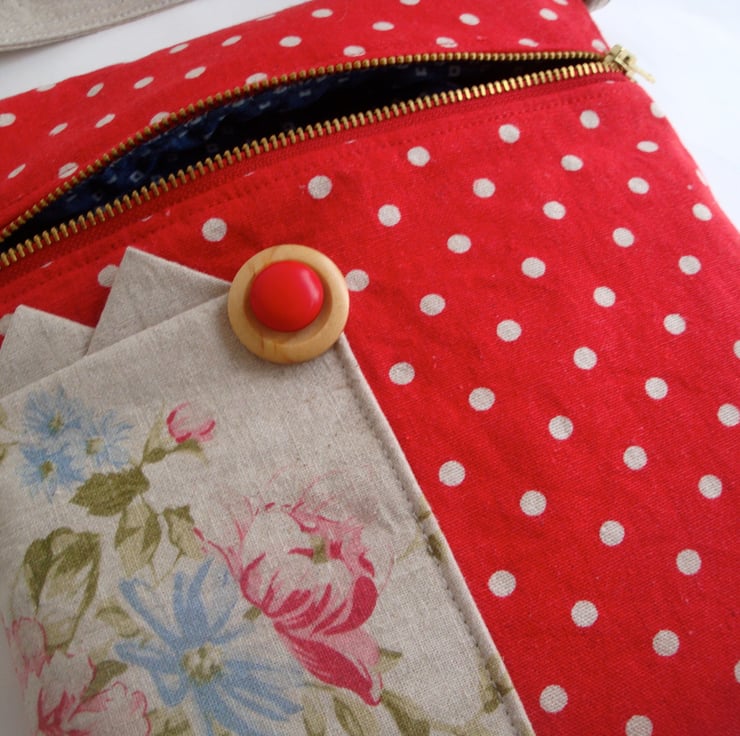 For making the bag , I used two lovely cotton / linen fabrics . Front of bag has a small patch pocket , embellished with buttons .