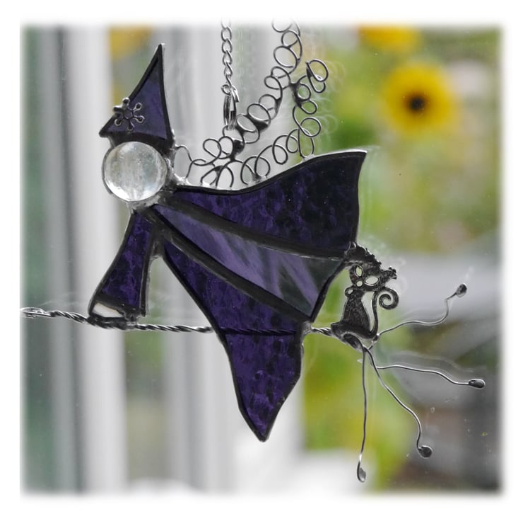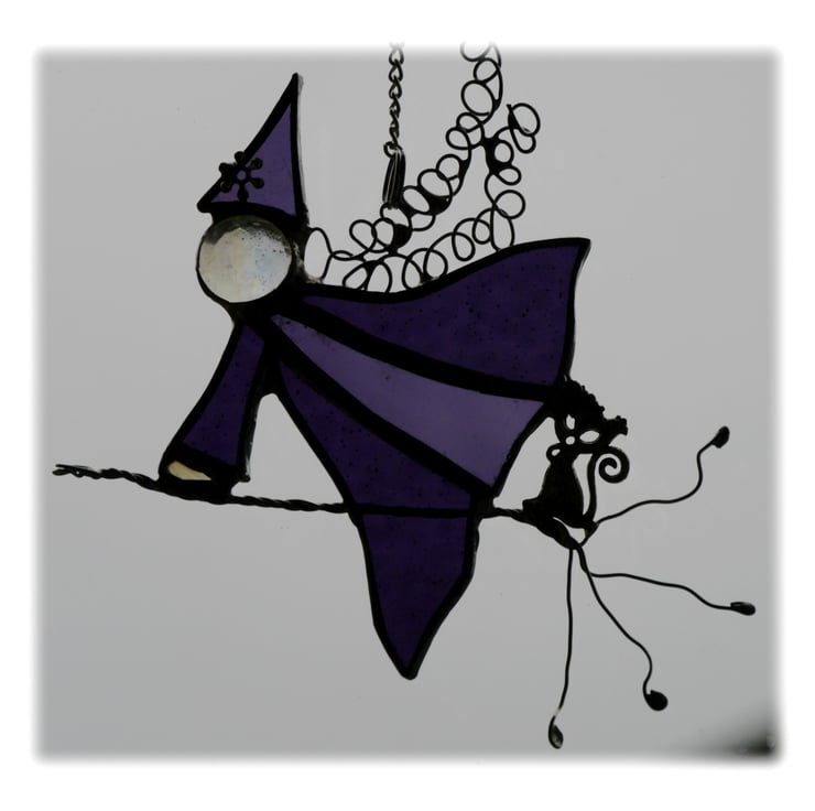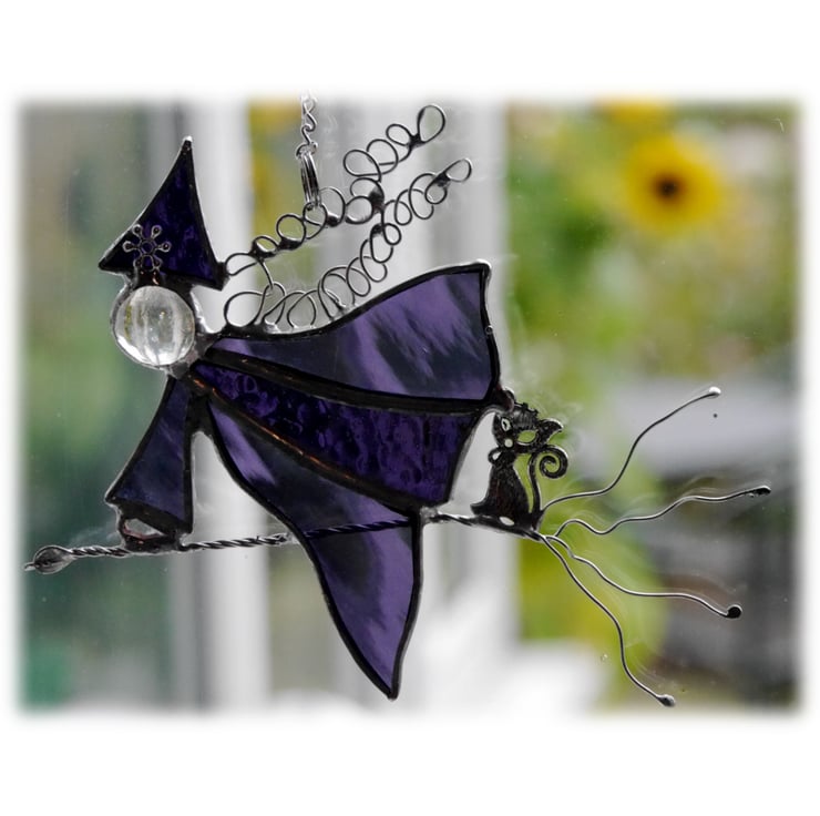 The witch is riding the skies on her broomstick which is made from twisted wire. Her cat rides behind.