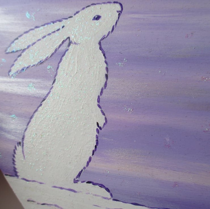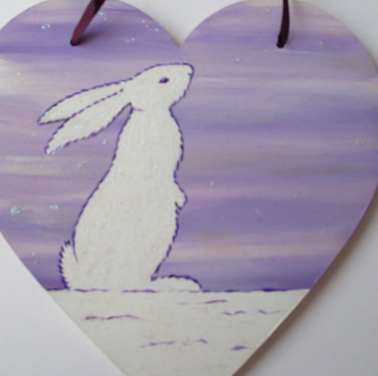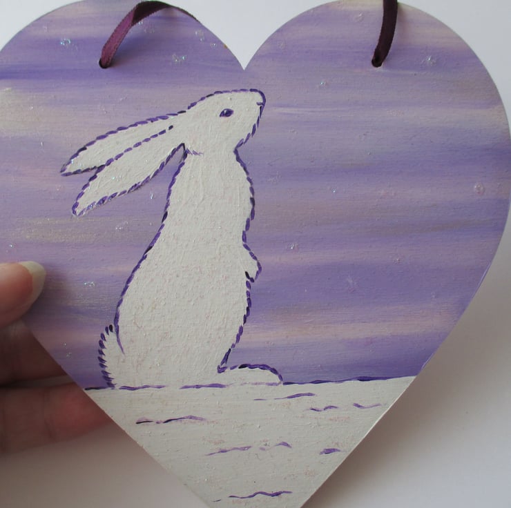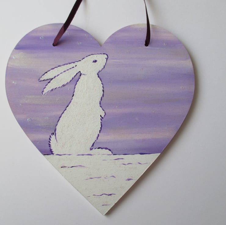 This is a large wooden love heart shape which has been painted in acrylics and varnished. A white bunny rabbit is painted on the heart, part of my Snowbunny' series.