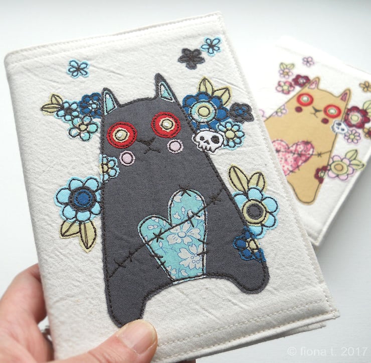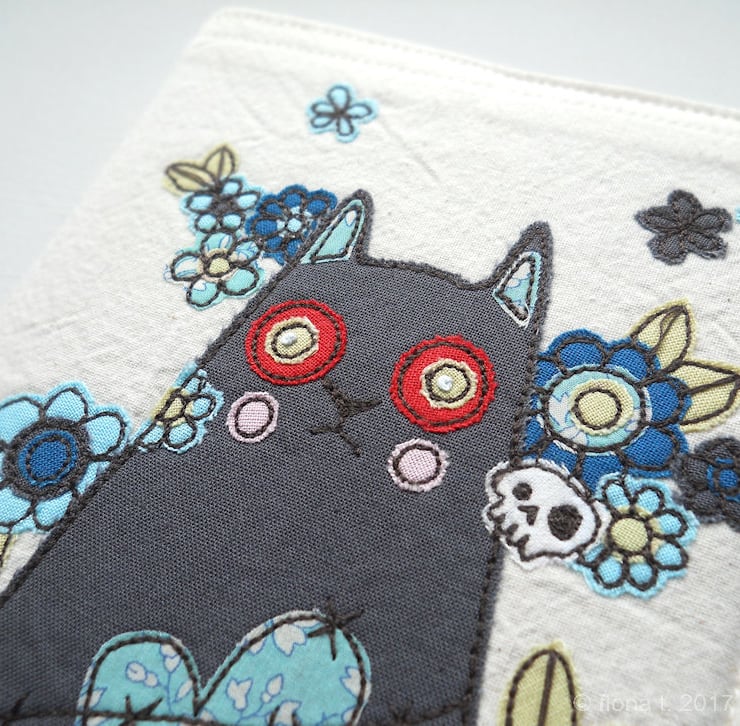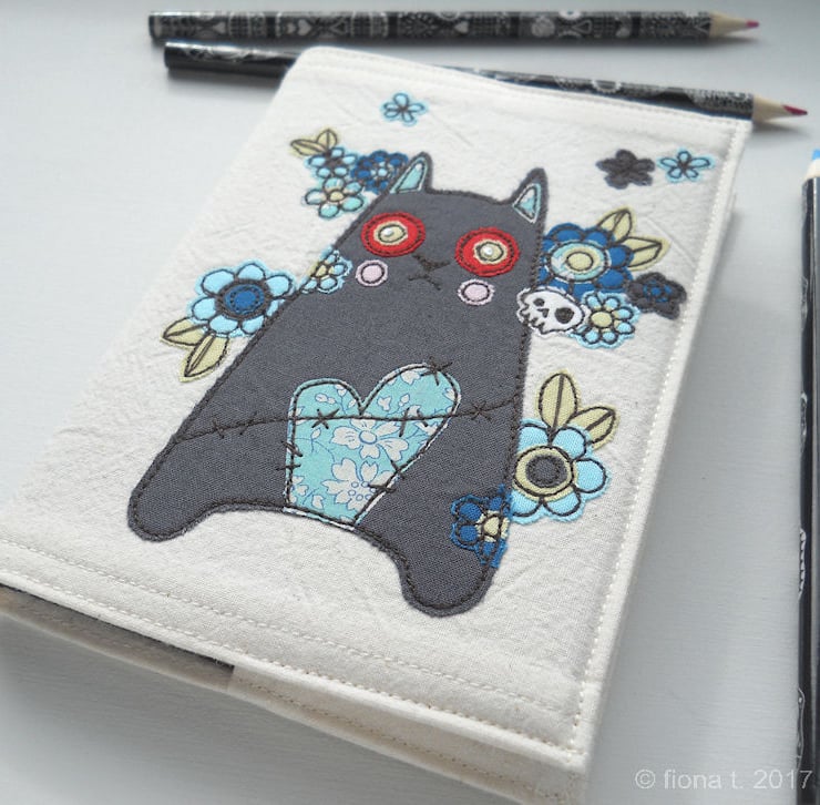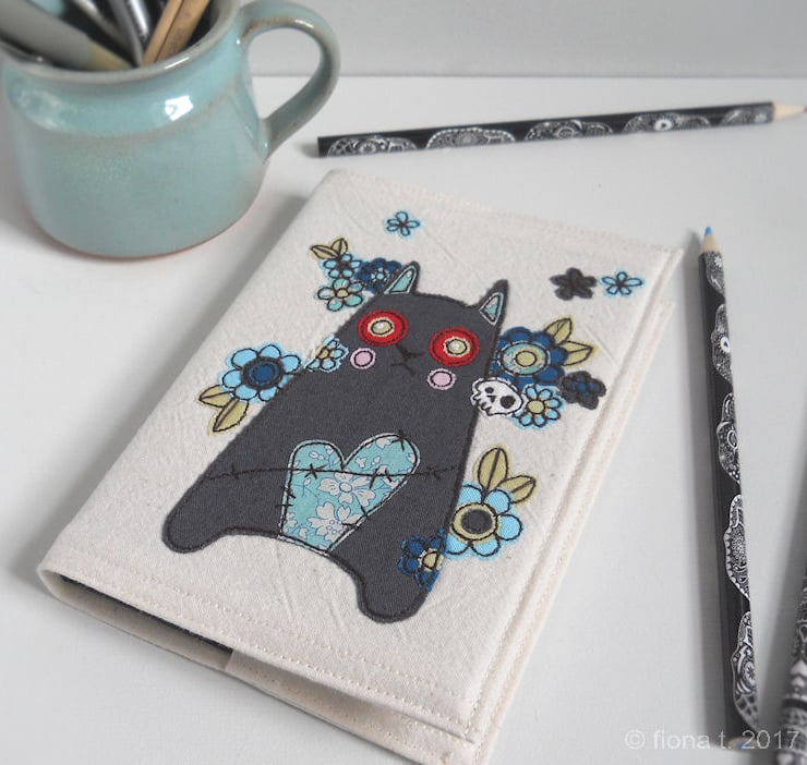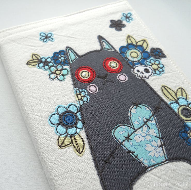 original applique & freehand embroidered floral kitty notebook cover with A6 sketchbook - black cat.