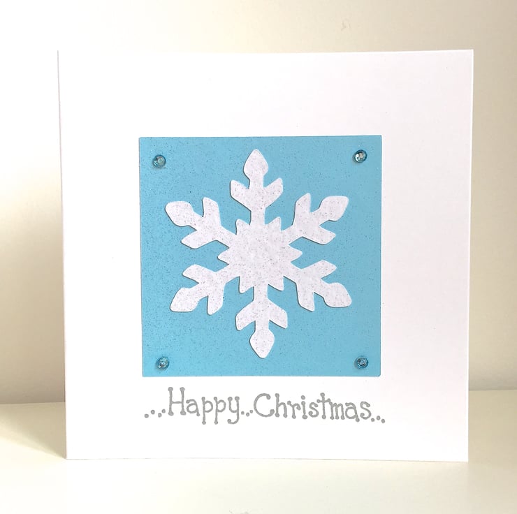 Snowflake Christmas card featuring a white snowflake against a fine glittery blue background, with four faux sapphire jewels in each corner. Part of a series of handmade Christmas Cards!