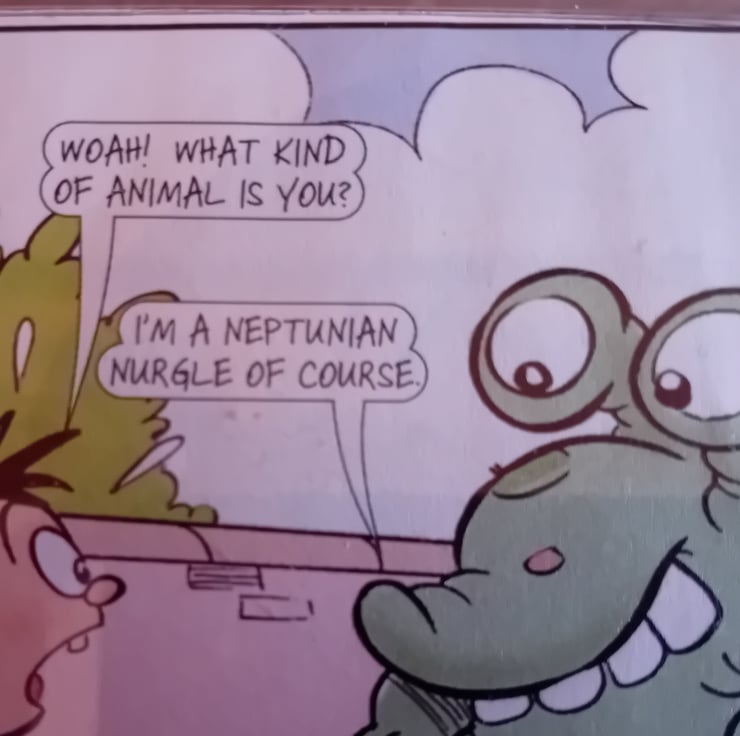 The image shows two aliens looking rather alarmed as a friendly human asks, “Can I help you?” — a classic bit of comic humour that feels even more charming in its new form.