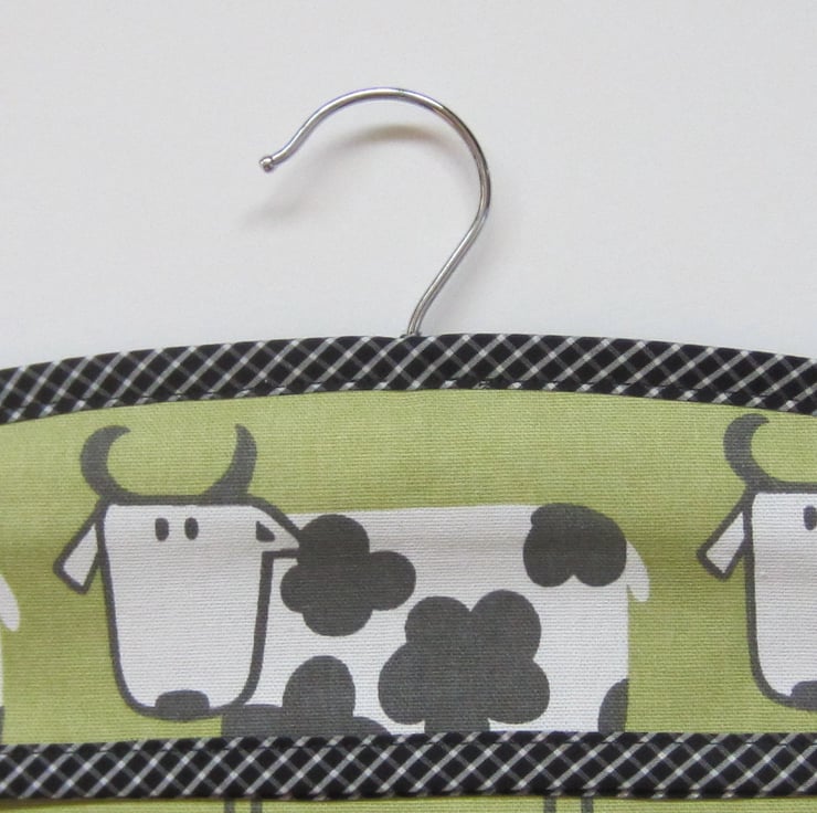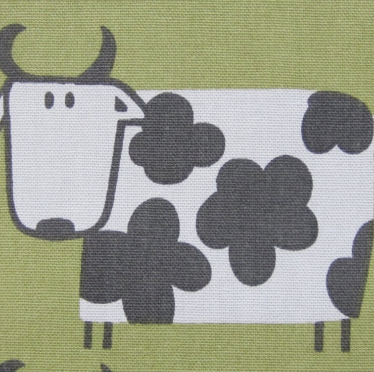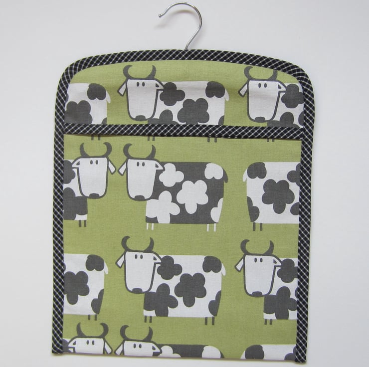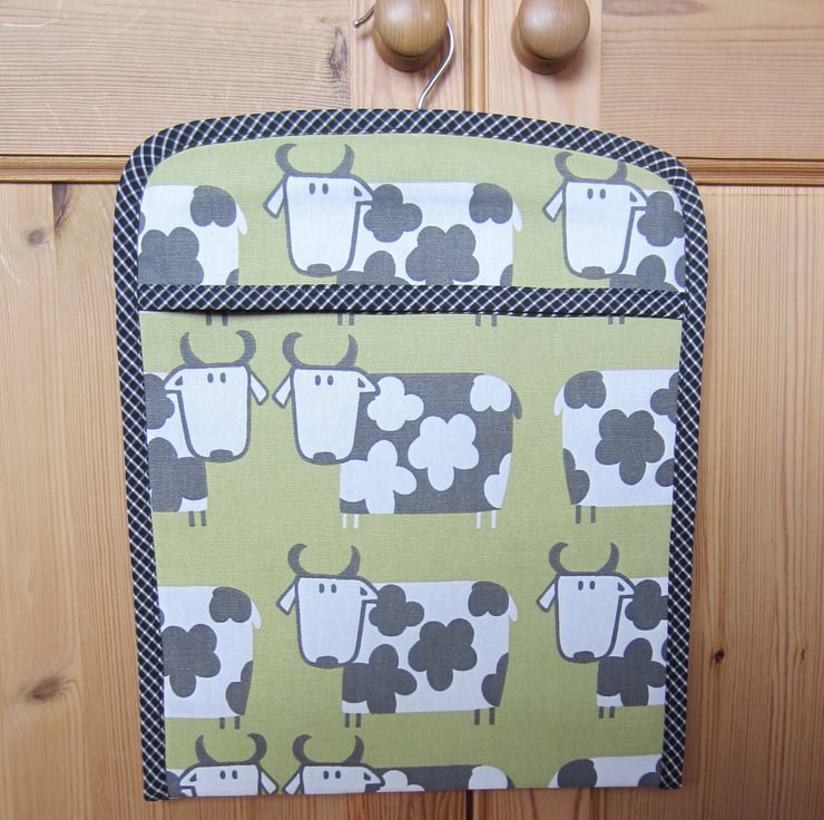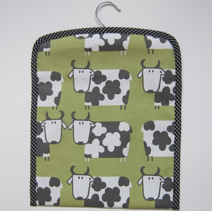 Sturdy peg bag in a quirky black and white cow design on a dull lime green background. Fully lined with a black fabric and edged in black and white check.