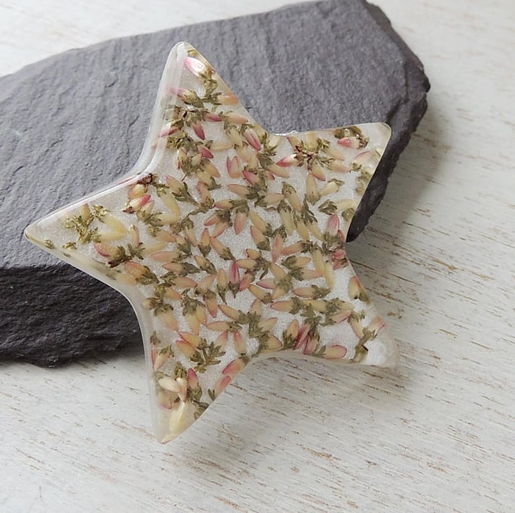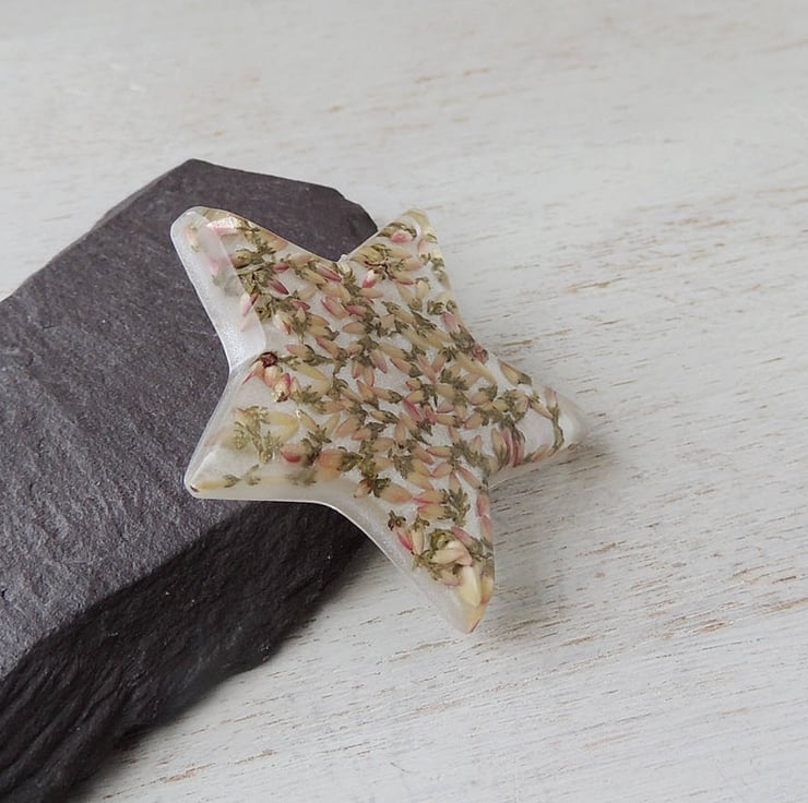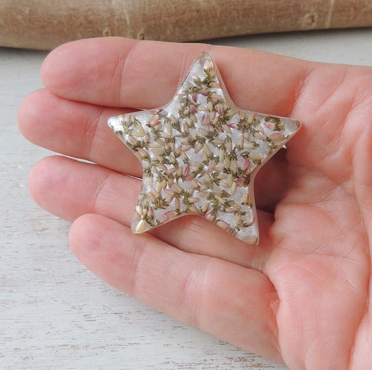 The Heather is from my garden that I have picked and pressed to use in my flower jewellery. I cast some of the tiny flowers in a resin star, finishing with a frosty white colour background. The brooch fitting was then attached to the reverse side.