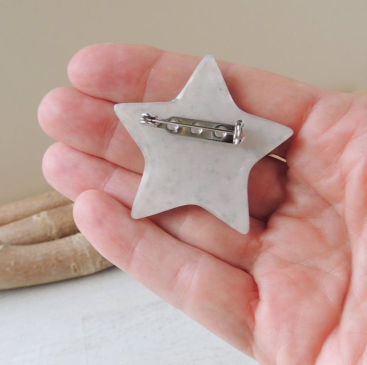 The resin star measures 4.5cm x 4.5cm x 0.6cm. It's quite a large brooch.