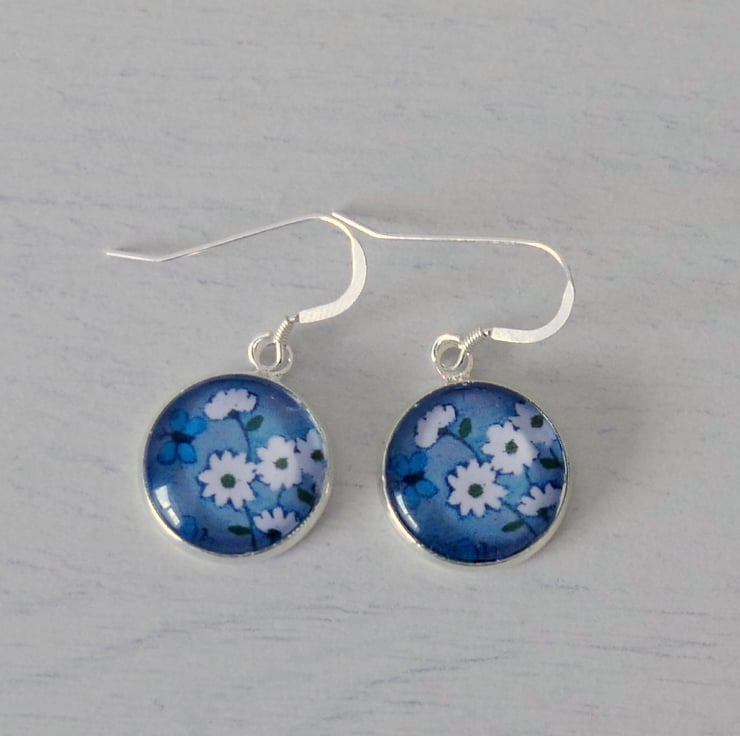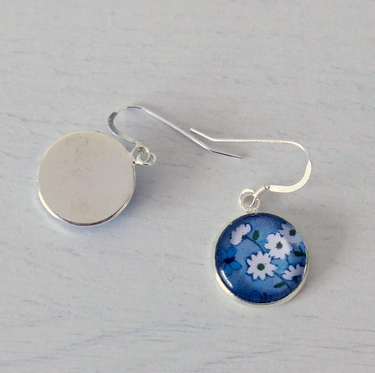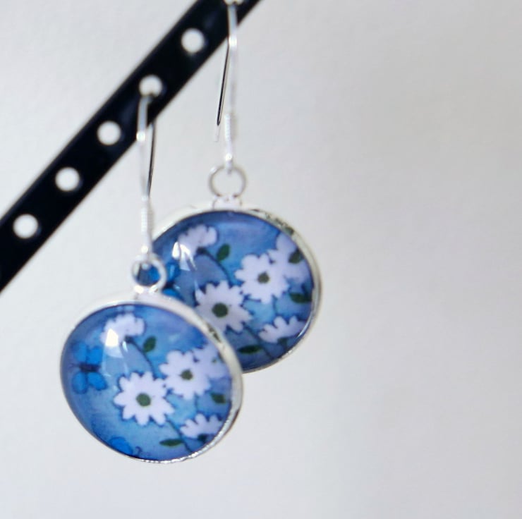 I made these grey dangle earrings using two mini prints after one of my original floral paintings featuring a white daisy bouquet and turquoise butterflies against a grey background. The images are glued onto the silver plated settings and sealed under a glass cabochon. The settings are approx 16mm and the earrings with the earwires are approx 1.5". The earwires are sterling silver.