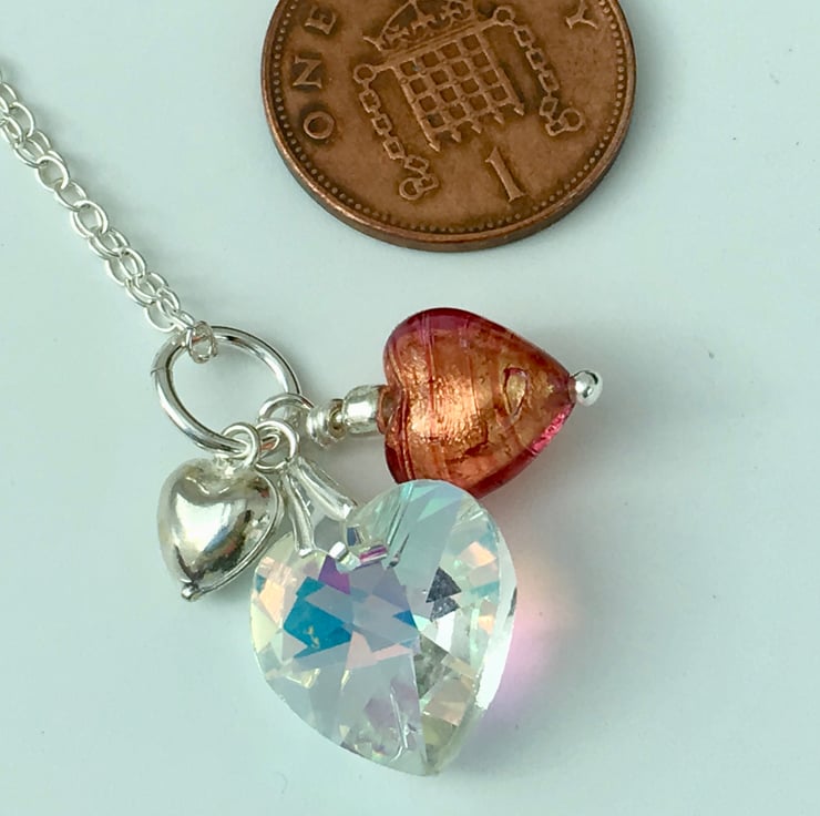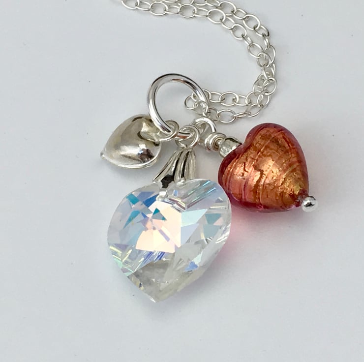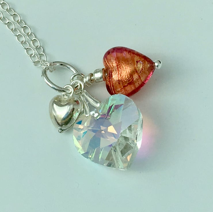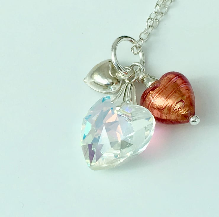 Three Hearts Necklace. Crystal, Venetian glass and Silver Pendant.