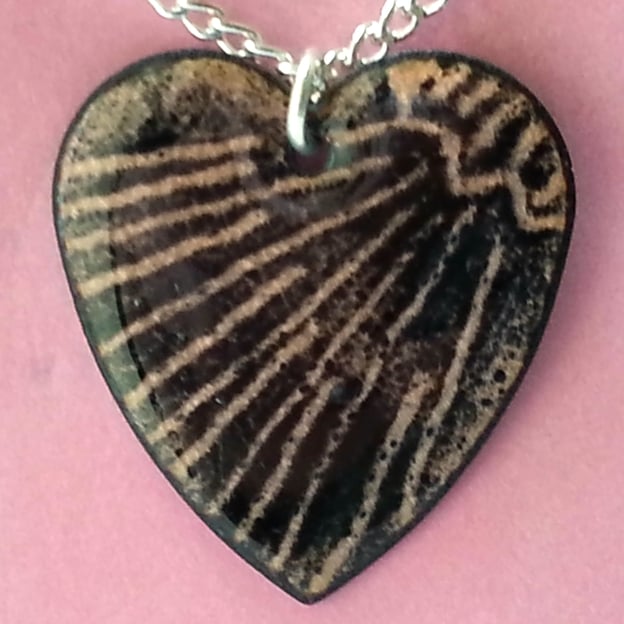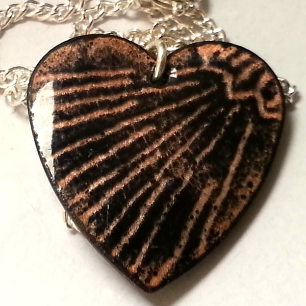 I have made the pendant by first building a base of clear enamel on the copper shape. This shows the coppper, golden brown. I added a coat of black enamel over this and before firing the piece I drew in the cloud shape and the sun's rays to create the design I planned.