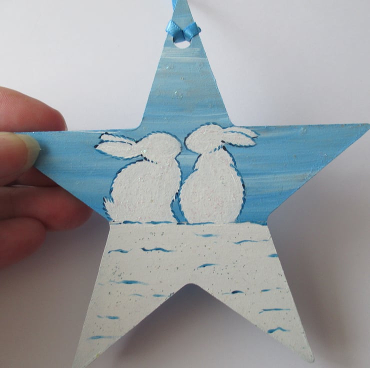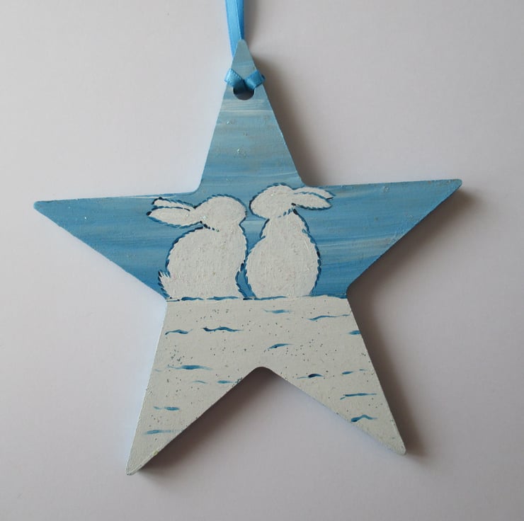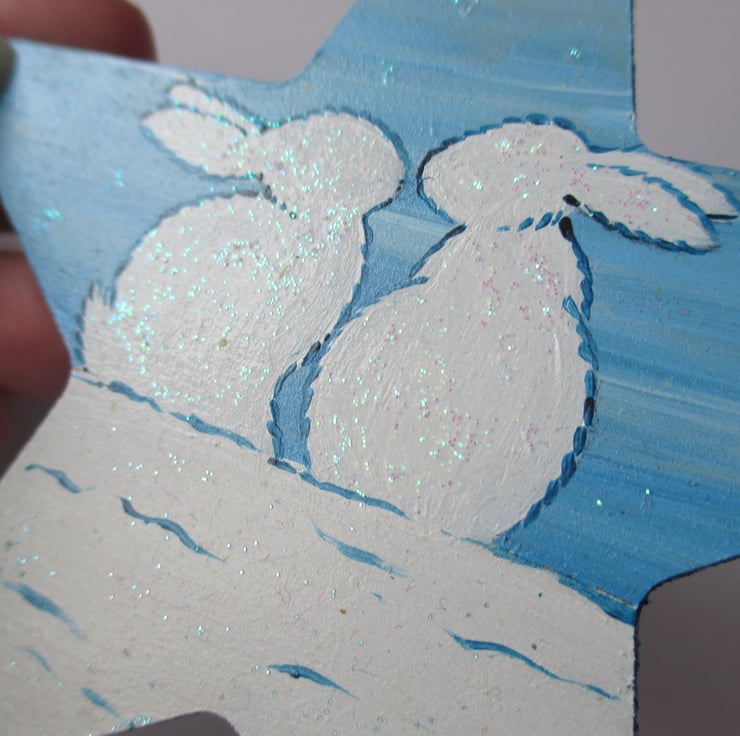 This is a wooden 2D star heart shape, which has been painted in acrylics with glitter detail, and features some of my Snow Bunnies. They are glittery white, against a blue sky.