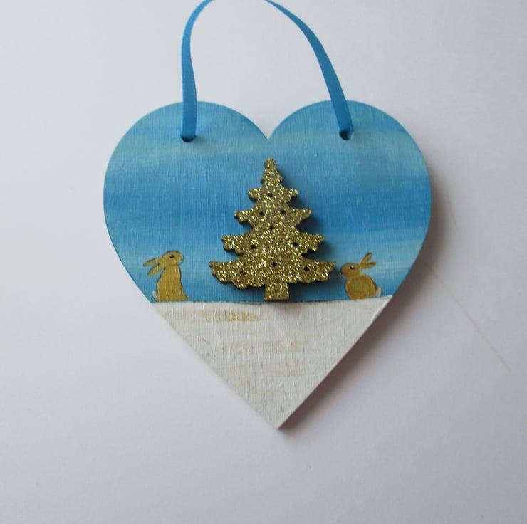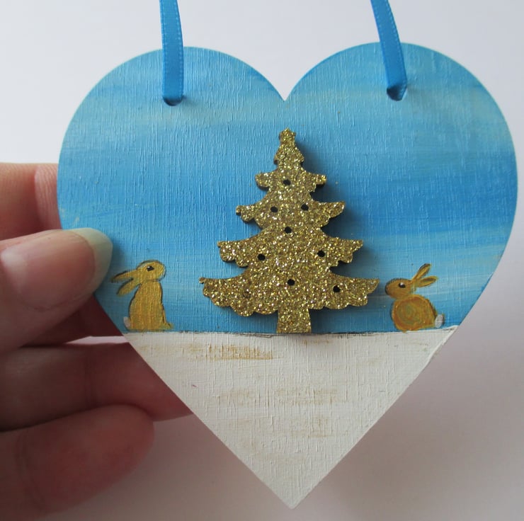 This is a wooden 2D love heart shape, which has been painted in acrylics with glitter detail, embellished with a wooden Christmas tree shape which is coated in gold glitter, and with a tiny gokd bunny rabbit painted each side of the Christmas tree.