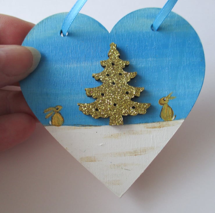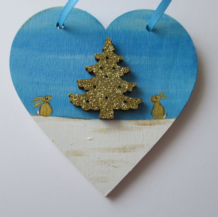 This is a wooden 2D love heart shape, which has been painted in acrylics with glitter detail, embellished with a wooden Christmas tree shape which is coated in gold glitter, and with a tiny gokd bunny rabbit painted each side of the Christmas tree.