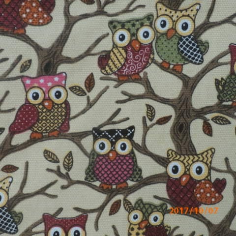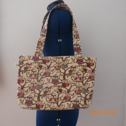 This cotton tote ,shoulder bag is made from a cotton fabric it has a canvas look to it the design on the fabric is of different multi coloured owls sitting on a tree, the back ground of the fabric is in a dark cream .