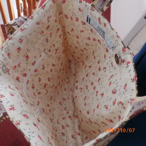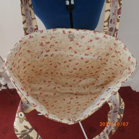 The handles have a cotton tape sitched to the wrong side of the to cover the centre seam and this adds decor to the bag the tape has printed owls, tress and bird houses this tape looks like hessian keeping the country look to the bag .