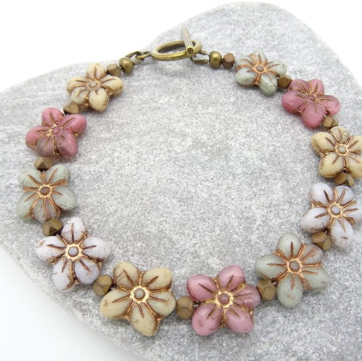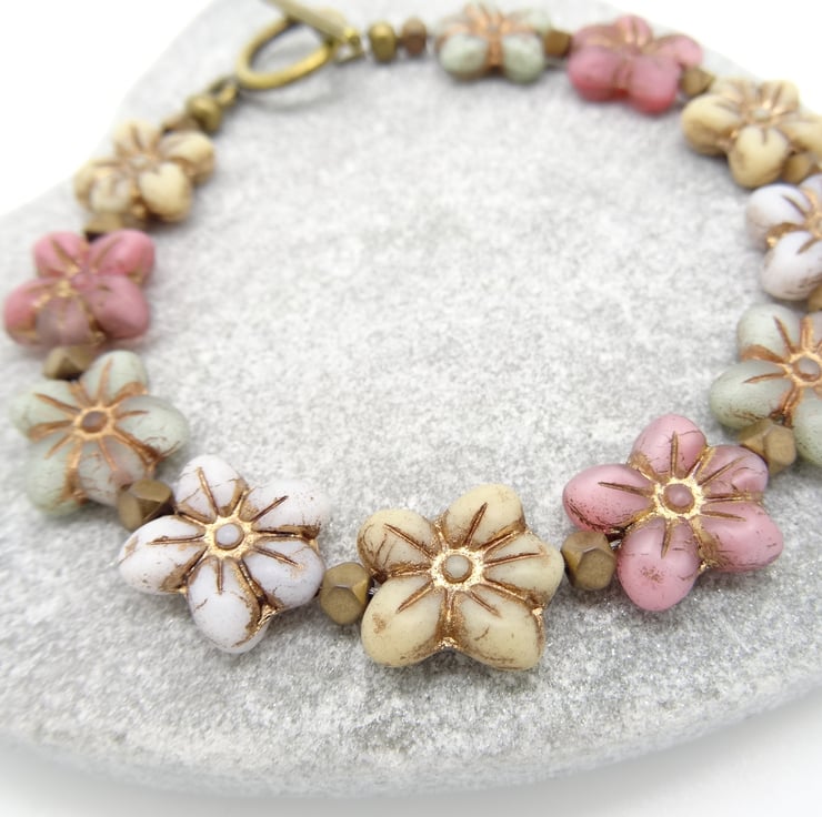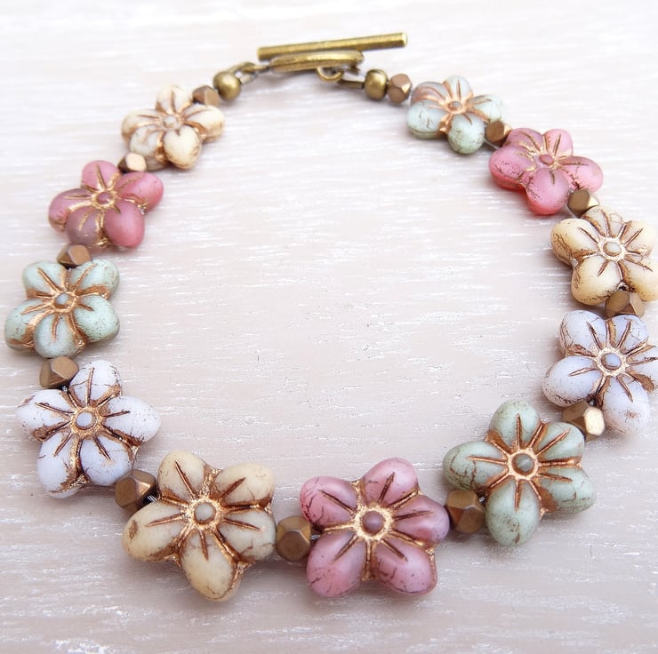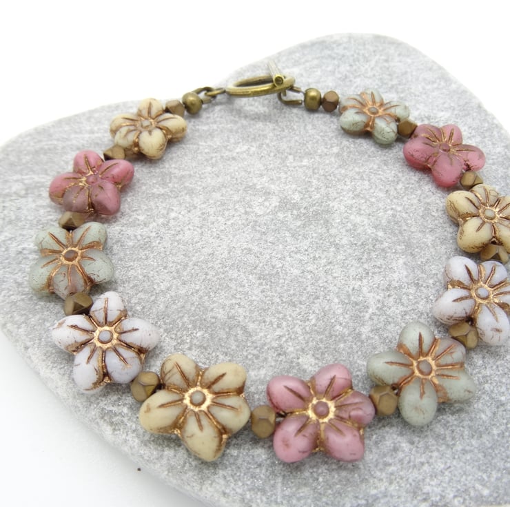 This is a pretty bracelet made with12 x 13mm czech glass puffed daisies with an antiqued finish. The colours are lovely pastels including cream/toffee, dusky pink, palest of green/blue and grey. These are interspersed with antique bronze coloured faceted spacer beads. The bracelet measures 8.5 inches (just over 21cm) and closes with a antique bronze coloured toggle clasp.