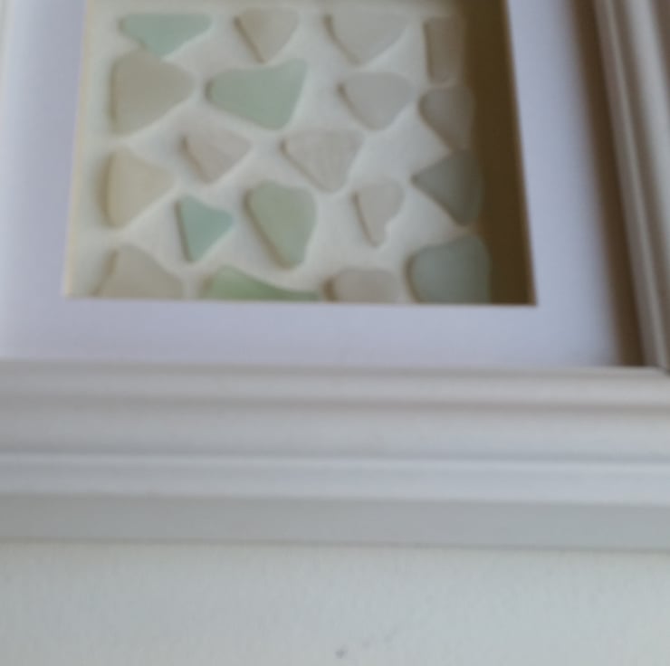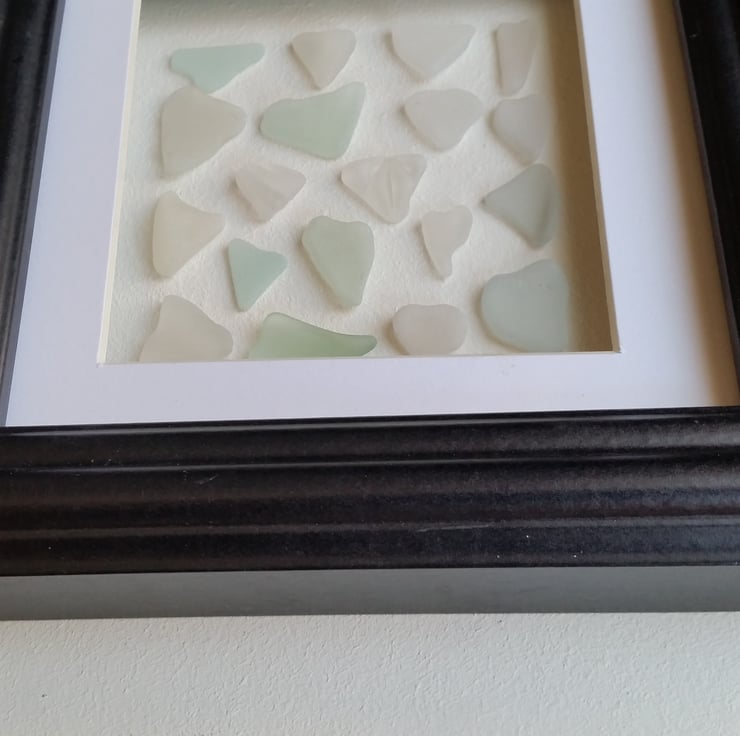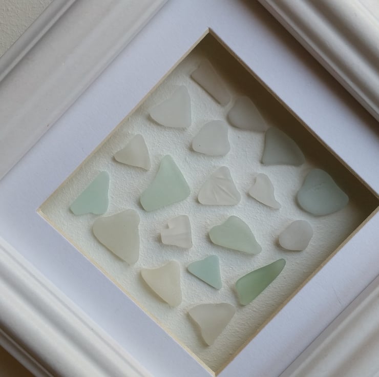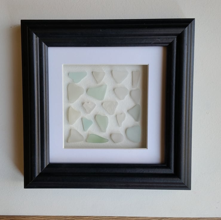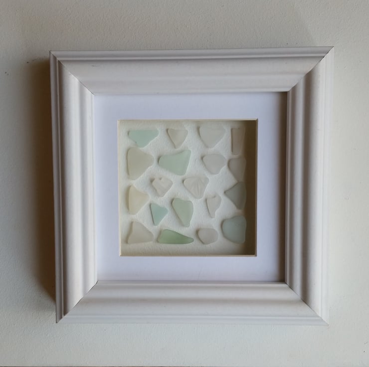 A frame full of genuine heart shaped nuggets of Cornish sea glass arranged in a 20cm square frame that will stand alone or hang on the wall.
