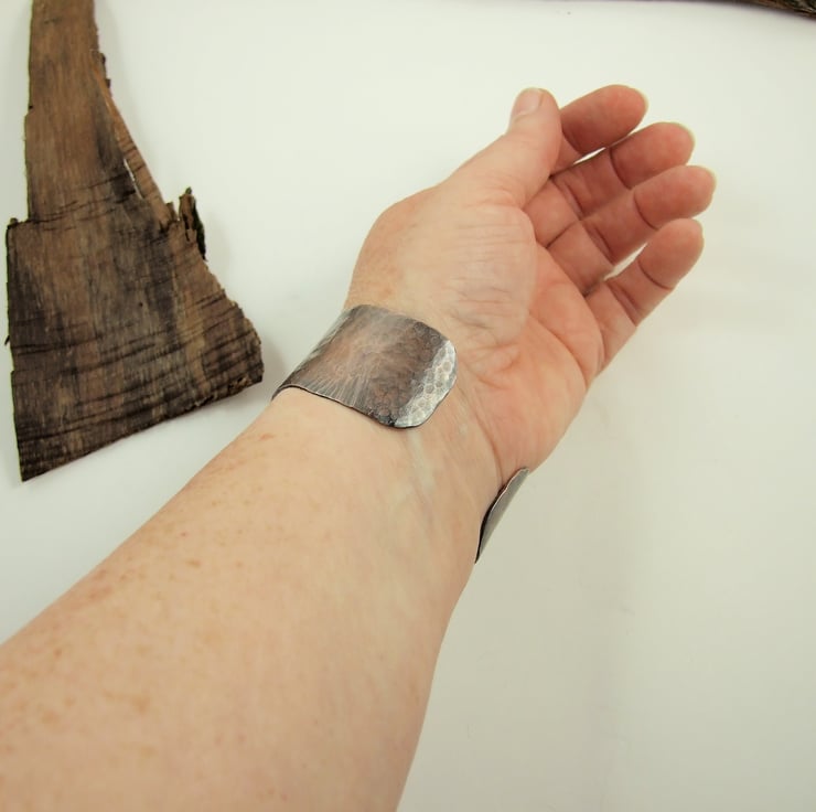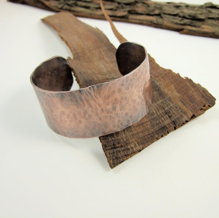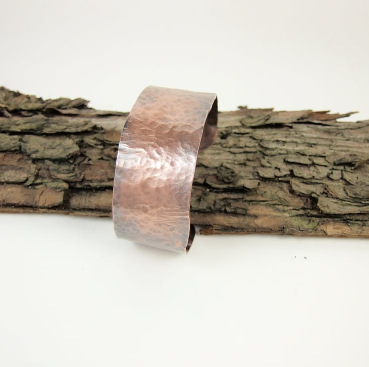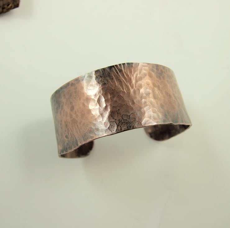 I have made the bangle from 1 inch wide solid medium thickness copper sheet which I have hammered for texture then sanded and shaped.