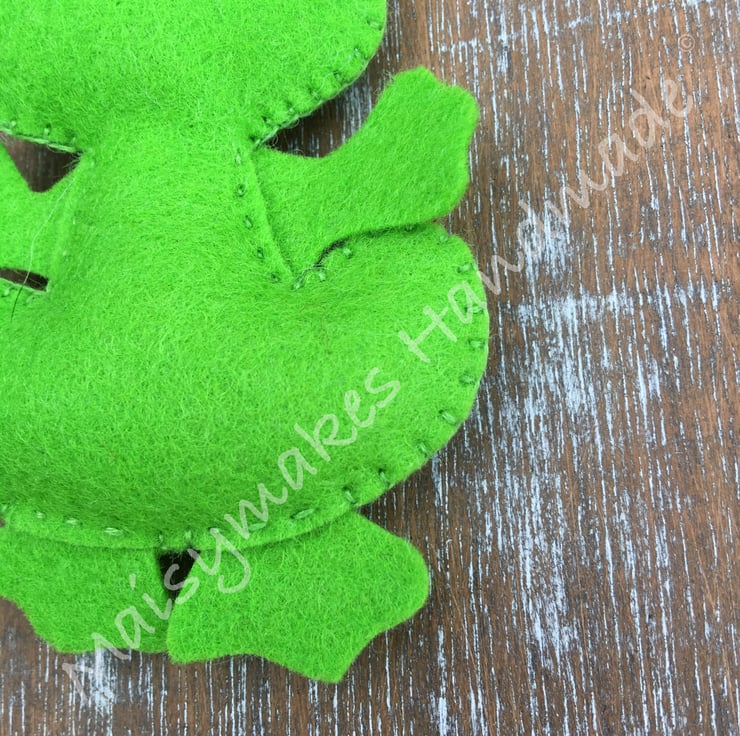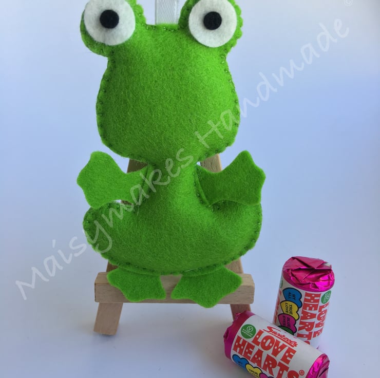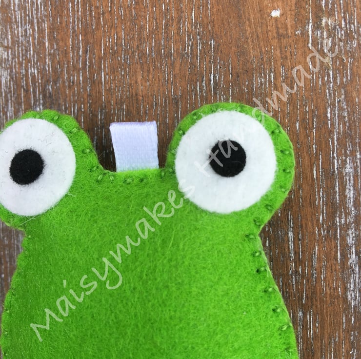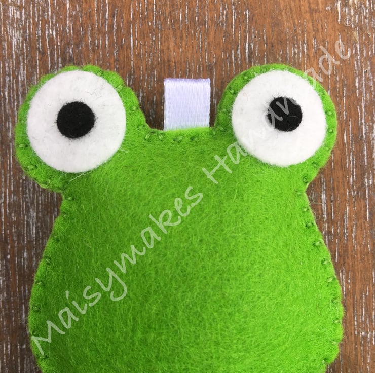 This cute Green Frog has been designed from my own original hand drawn image, and has been made completely by hand by myself. It is made from 100% wool felt and has a ribbon loop attached for ease of hanging. This unique item would be perfect as a wall or door decoration in a nursery or childs bedroom.