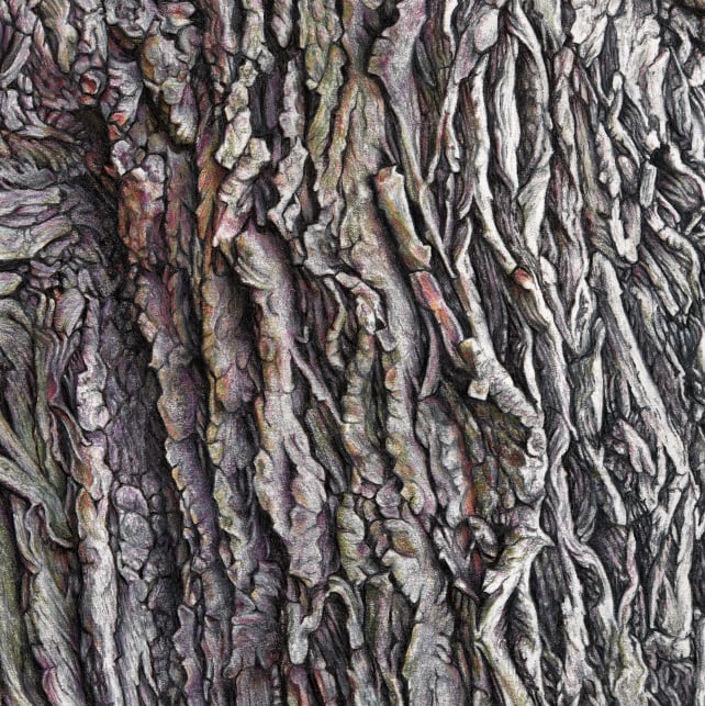 In a series of drawings inspired by the beauty of the textures and colours of tree trunks, I have focussed in on these sometimes complex details, revealing an overlooked world of natural wonder.