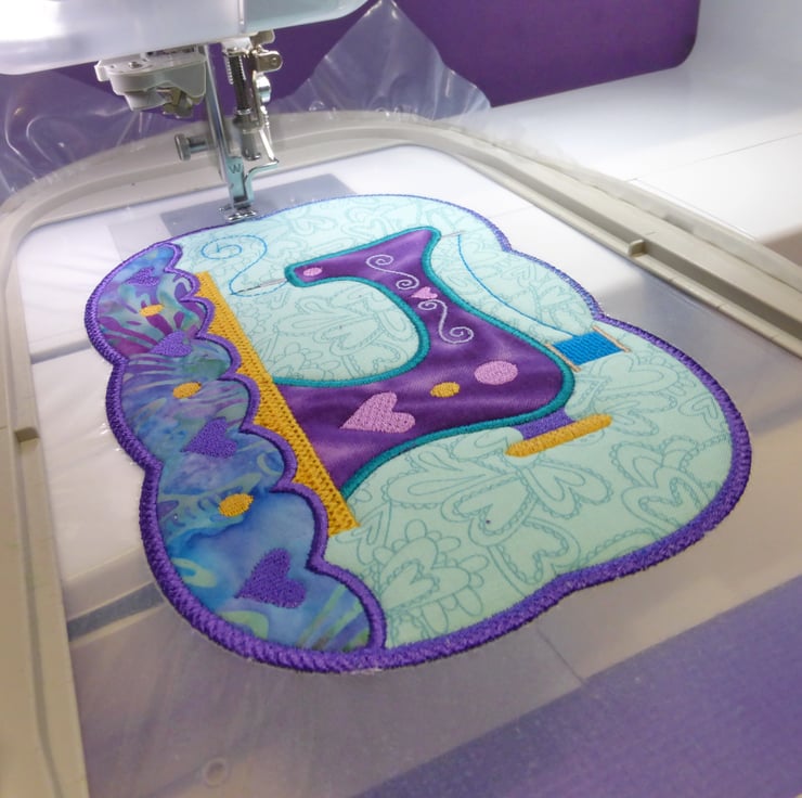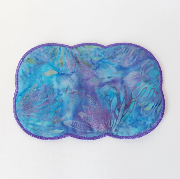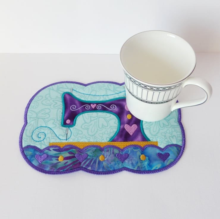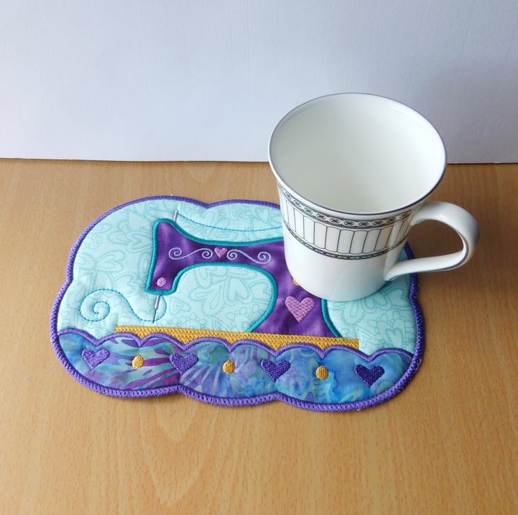 A lovely mug rug made in cotton fabric in shades of mint, purples and blues with embroidered highlights in various colours, featuring a sewing machine in purple.