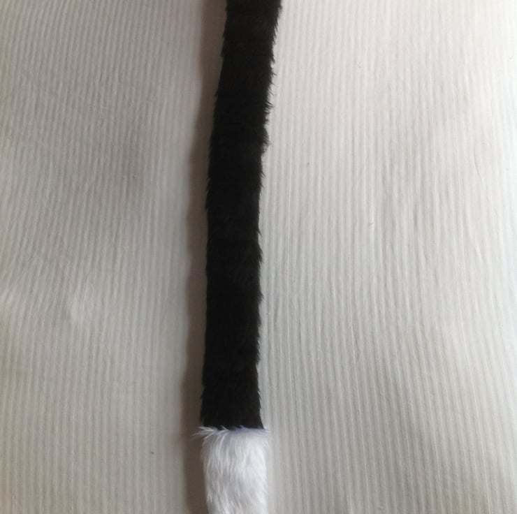 This is a cat tail made from black fur fabric with a white fur fabric tip. It measures 60cms long and comes supplied with a safety pin so it's ready to attach to your clothing.