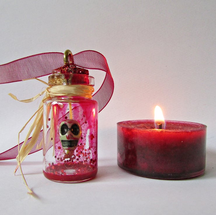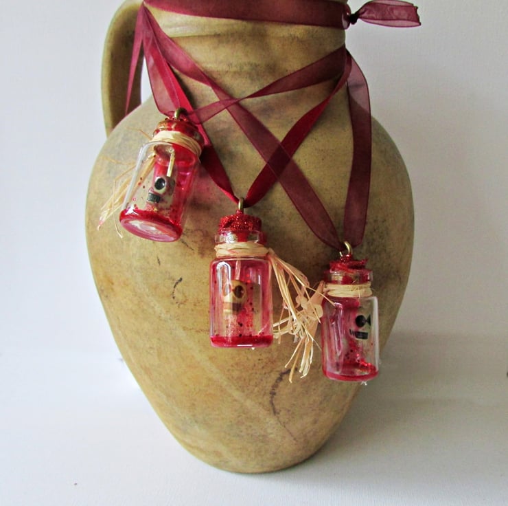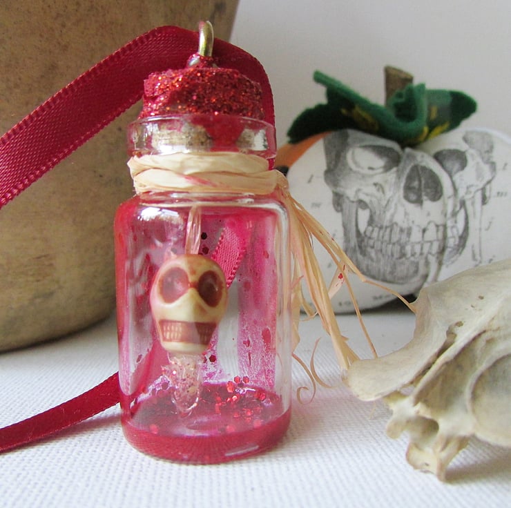 Scull in a Bottle, Halloween Decoration, Spooky Necklace. Can be used as a Hanging Scull or can sit on a shelf.