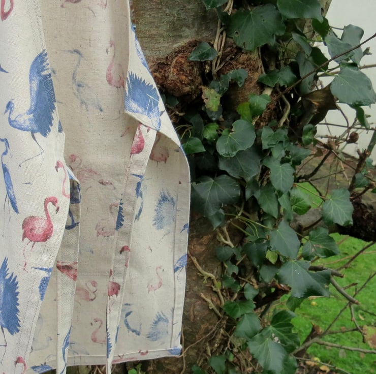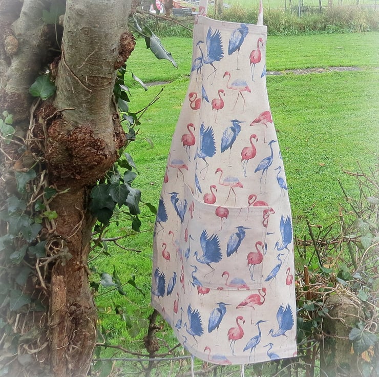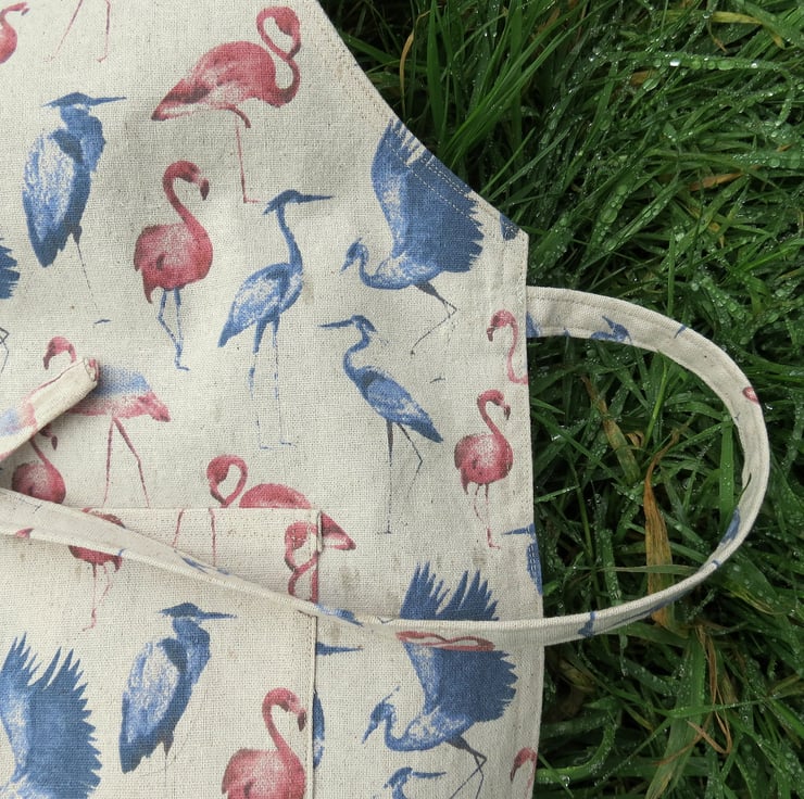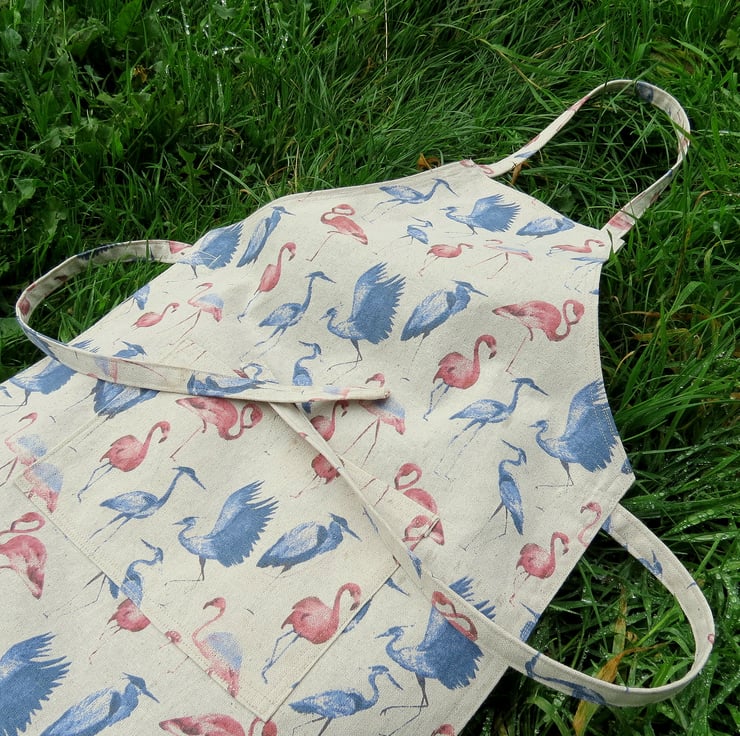 It is made from a medium weight cotton, with matching ties and a front pocket.