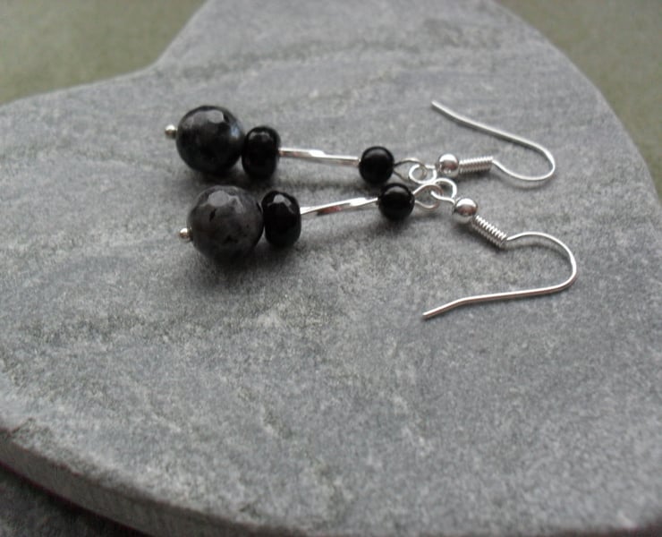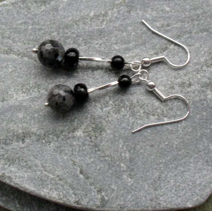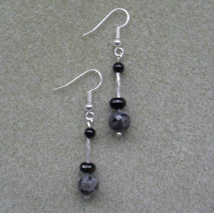 With black agate and silver plated long tube beads are attached to silver plated ear wires