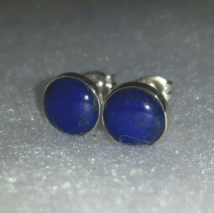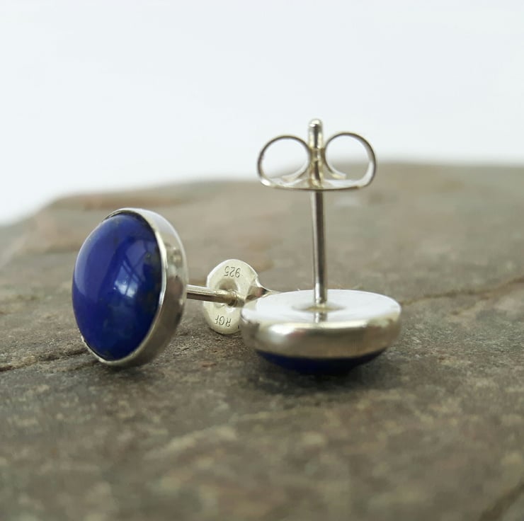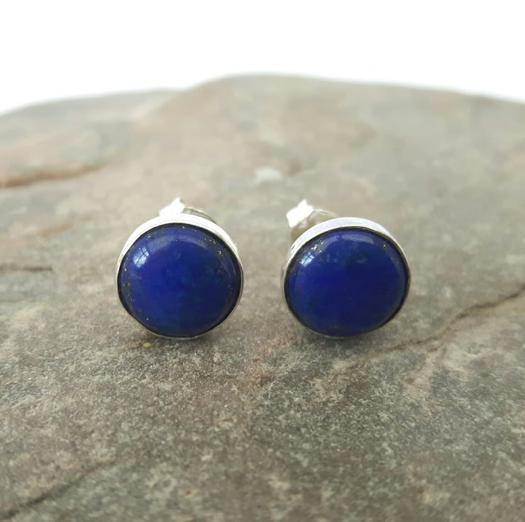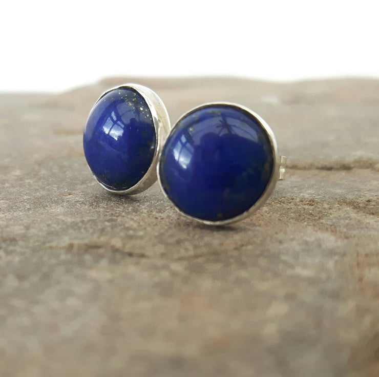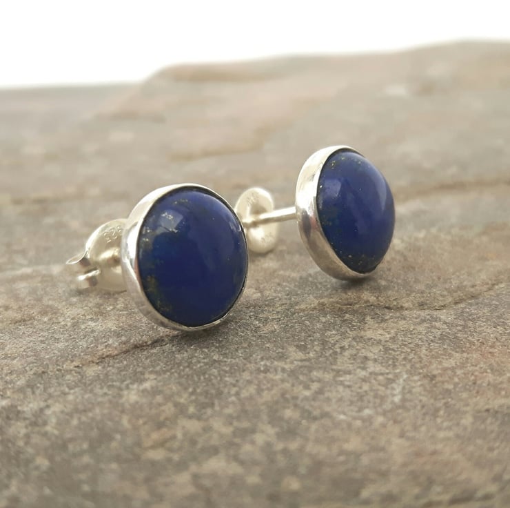 These sterling silver and gemstone earrings feature beautiful cabochons of royal blue Lapis lazuli, flecked with gold Pyrites - perfect for day or evening wear. Lapis is the birthstone for September. The stones are round, 8mm in diameter and securely seated in Sterling silver bezel cups. The ear posts connect with butterfly scrolls which are also of sterling, stamped .925 to indicate the quality of the silver. These earrings will be packaged in a smart gift box and sent to you by Royal Mail first class post.
