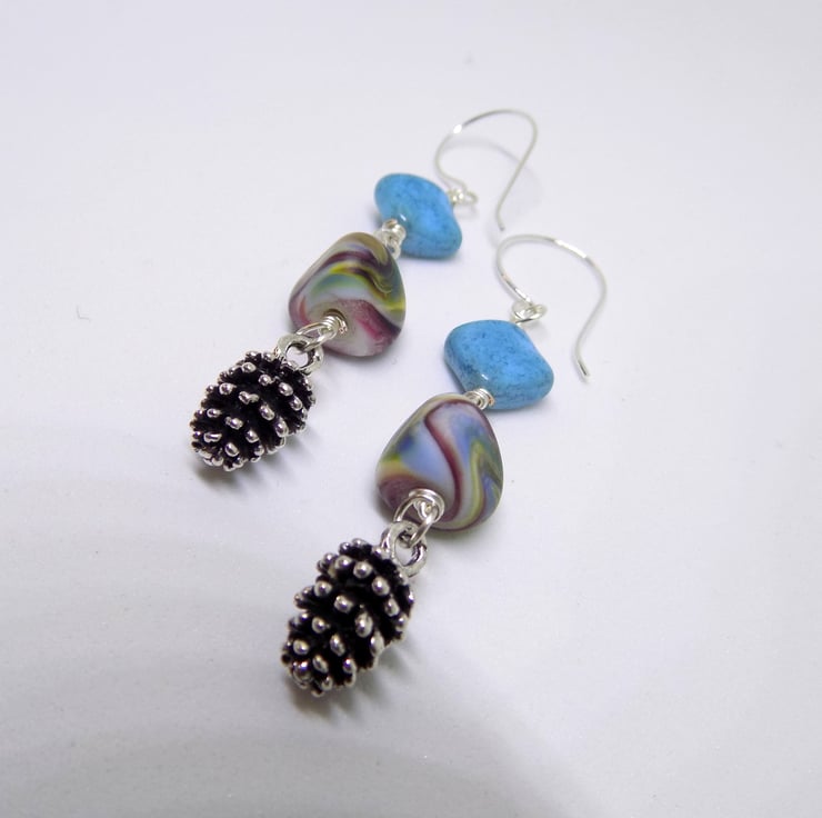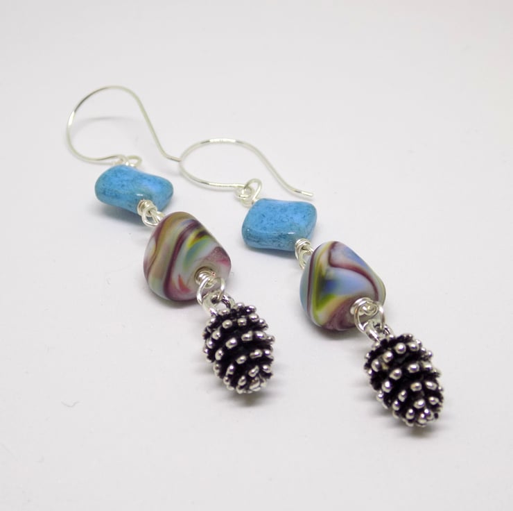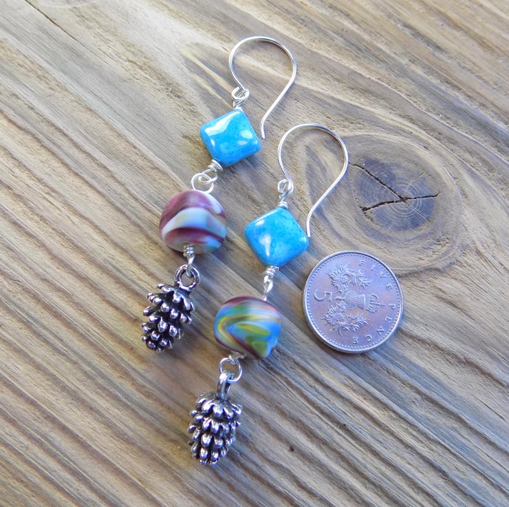 I have had these gorgeous handmade lamp work beads in my collection for ages, so I decided they would look wonderful as part of these dangle earrings. They almost resemble sweeties, and are complimented by the aqua square Czech beads and the adorable little pine cone charms. The earring hooks are handmade from 0.7 mm sterling silver wire, they have been tumbled for strength and shine. Length of dangle approx. 5 cm (not including hooks)