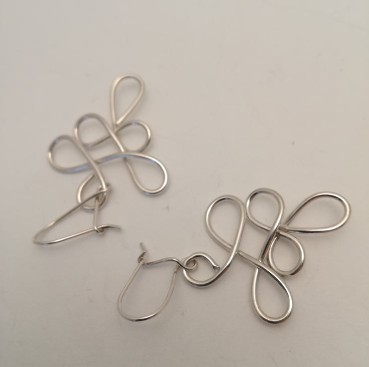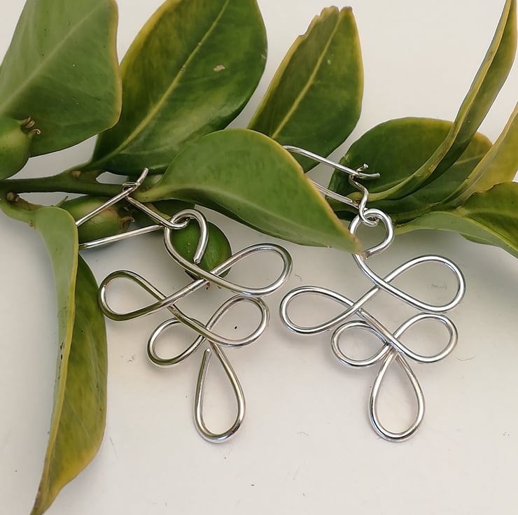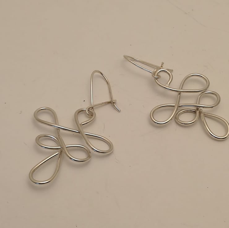 I had some good quality wire and just felt like attempting an unusual abstract pattern. I was feeling peaceful at the time and I feel this shape represents a peace that is proactive, peace that leads to fulfilling activity rather than inactivity. I have a pendant to match which I made first, then made these to coordinate with the pendant. They come packaged in a neat black card box with my logo on it.