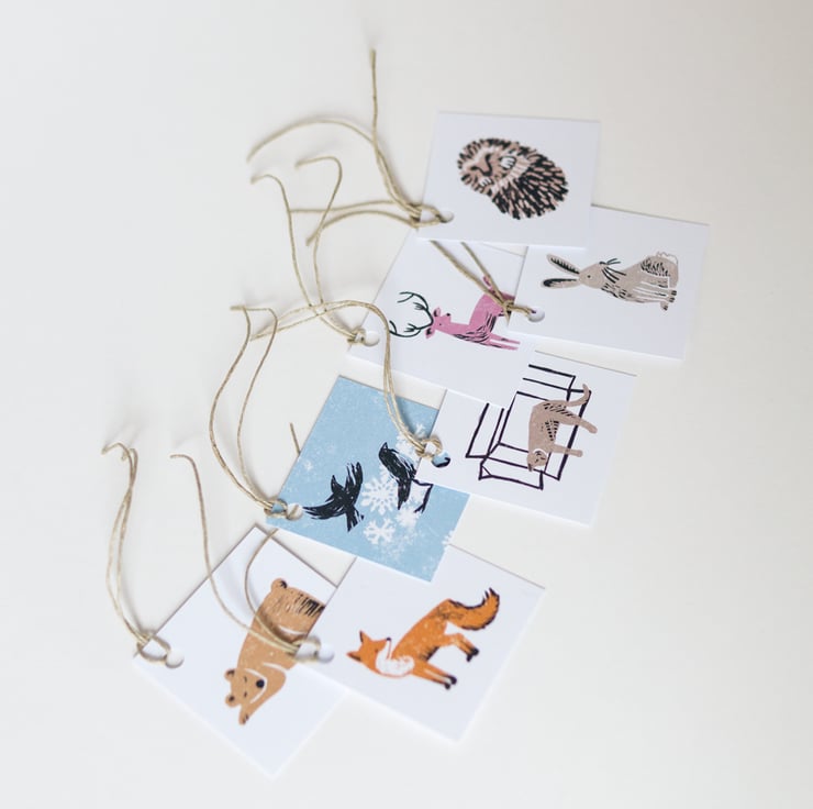 The set comprises two A2 sheets of gift wrap (size 420mm x 594mm) plus seven gift tags - one of each Winter Drifts animal plus a bonus hedgehog.