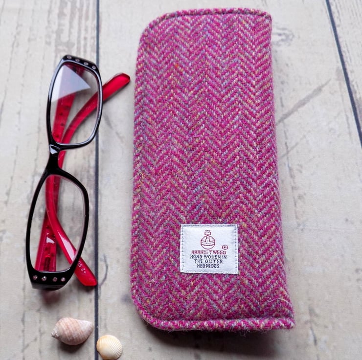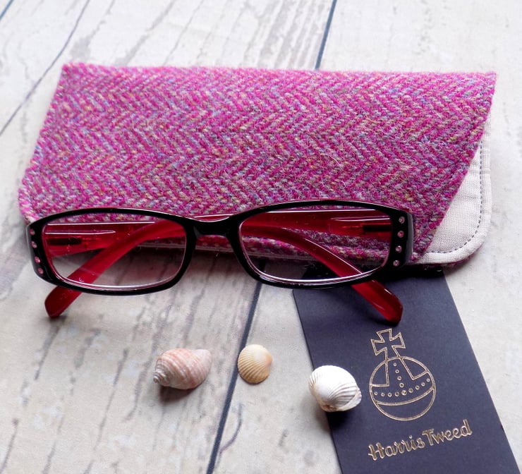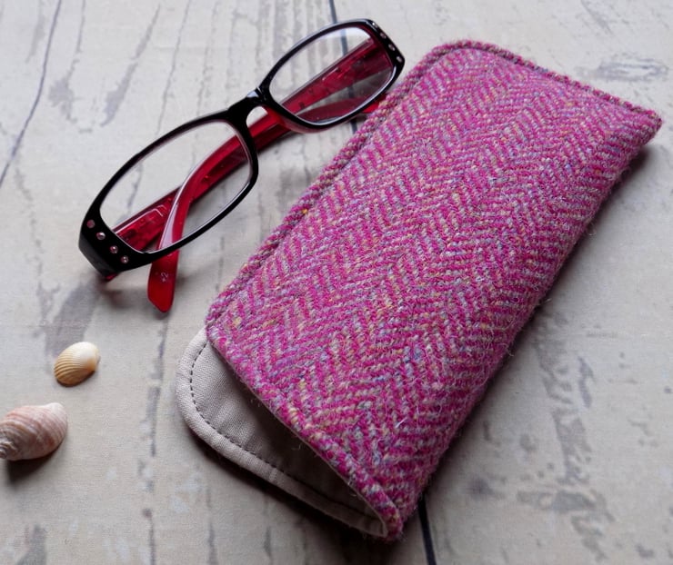Generously proportioned glasses case in deep magenta and beige Harris Tweed herringbone weave, with multicoloured flecks characteristic of this wonderful handwoven fabric.