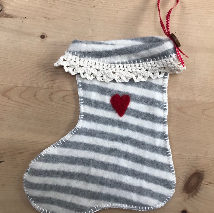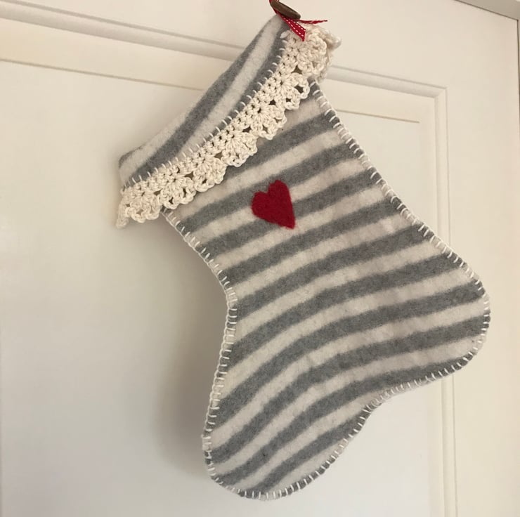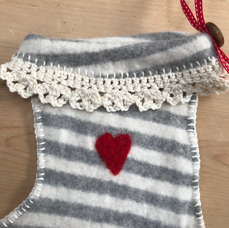 Very soft, felted cashmere stocking made from an old jumper shrunk in the wash! Decorated with a needle felted heart and blanket stitch and crochet edge in cotton yarn.