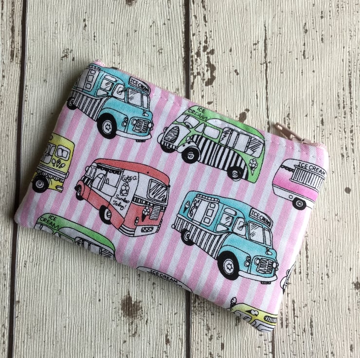 This fun little coin purse is created from a pink and white candy stripe cotton with a design of ice cream vans highlighted in black and shaded in colours of candy pink, mint green, vanilla yellow, polar blue and coral pink.