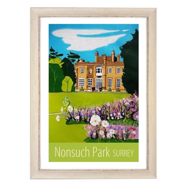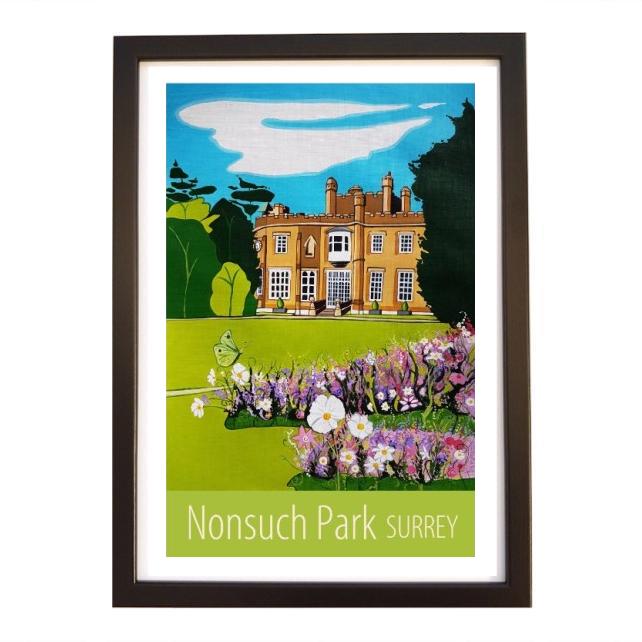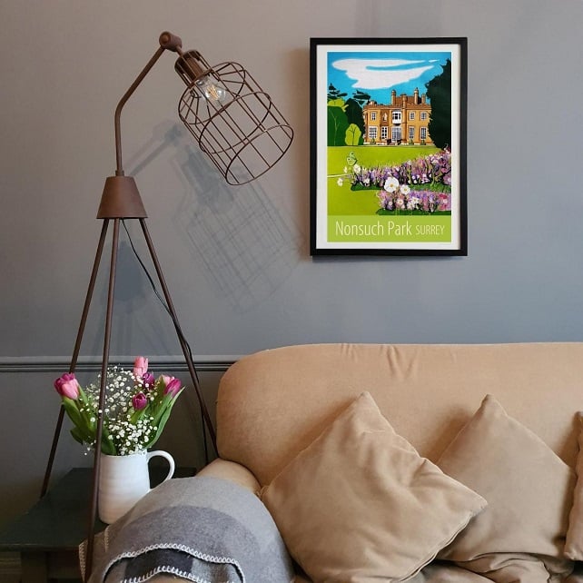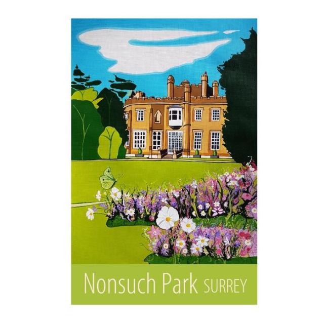 A contemporary travel poster style print of the lovely formal gardens and mansion in Nonsuch Park, Surrey, from my own original acrylic painting.