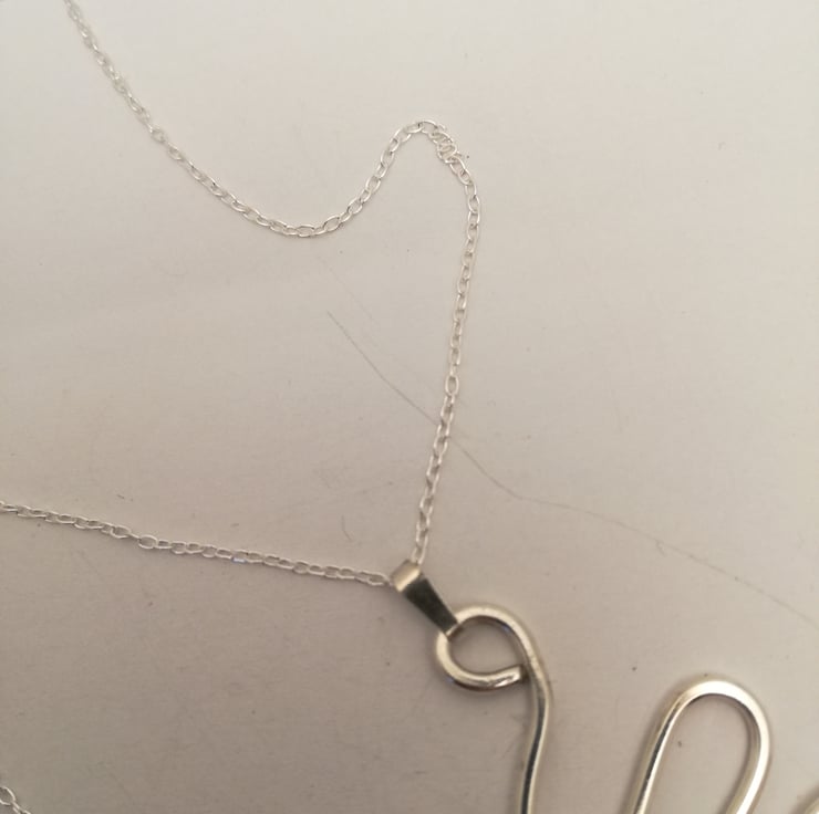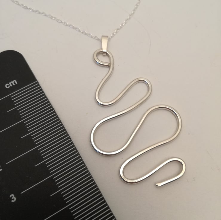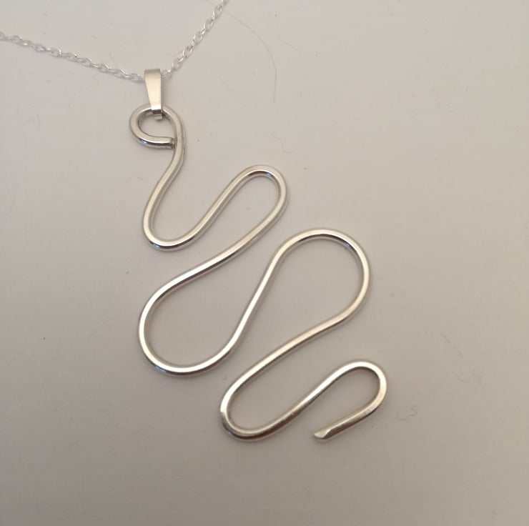 I was having fun playing with different angles and shapes in sterling silver wire and ended up with this wavy pendant. The waves increase and decrease in width giving a relaxed, flowing feel to the piece. It hangs on a beautiful, solid silver chain which enhances the simplicity of the waveform. There are matching earrings sold separately.