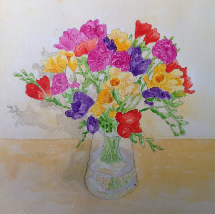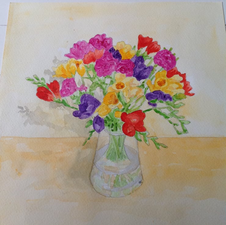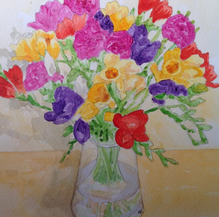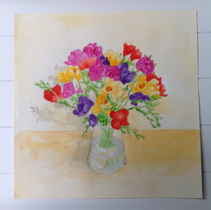 An original acrylic and watercolour painting of freesias in a glass vase.