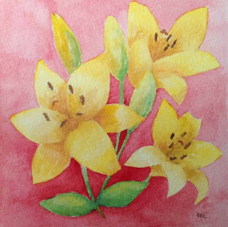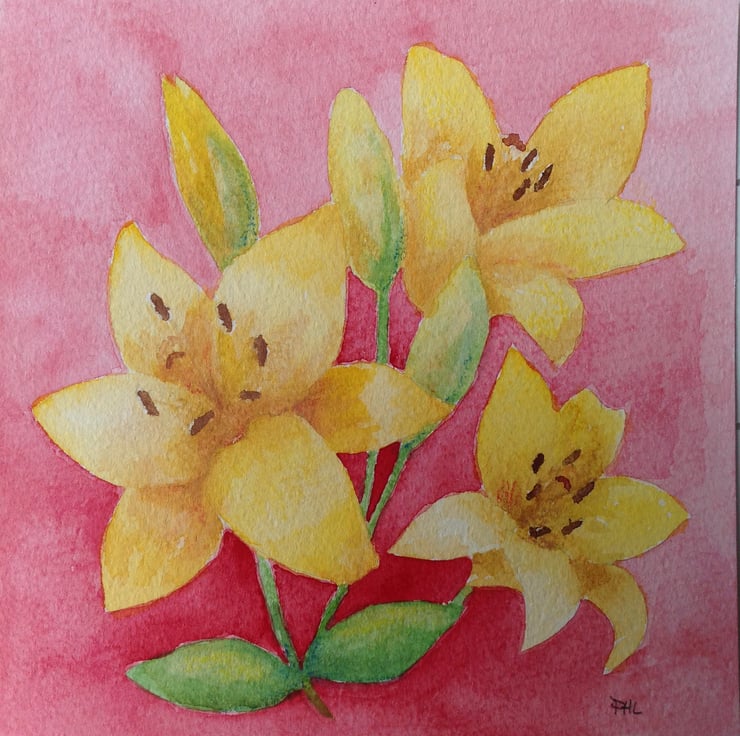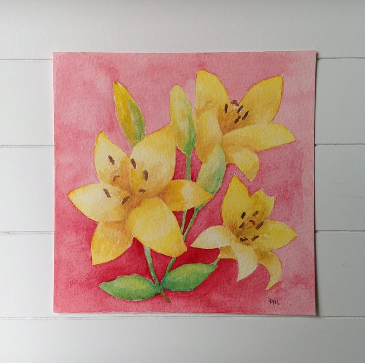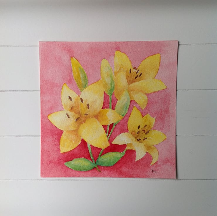 A stylised painting of yellow lilies, offered at a special price! It would make an inexpensive gift for a birthday or Christmas, ready to be framed to suit the recipient's decor.