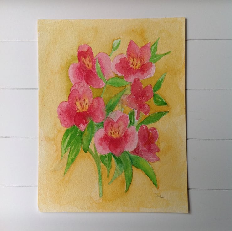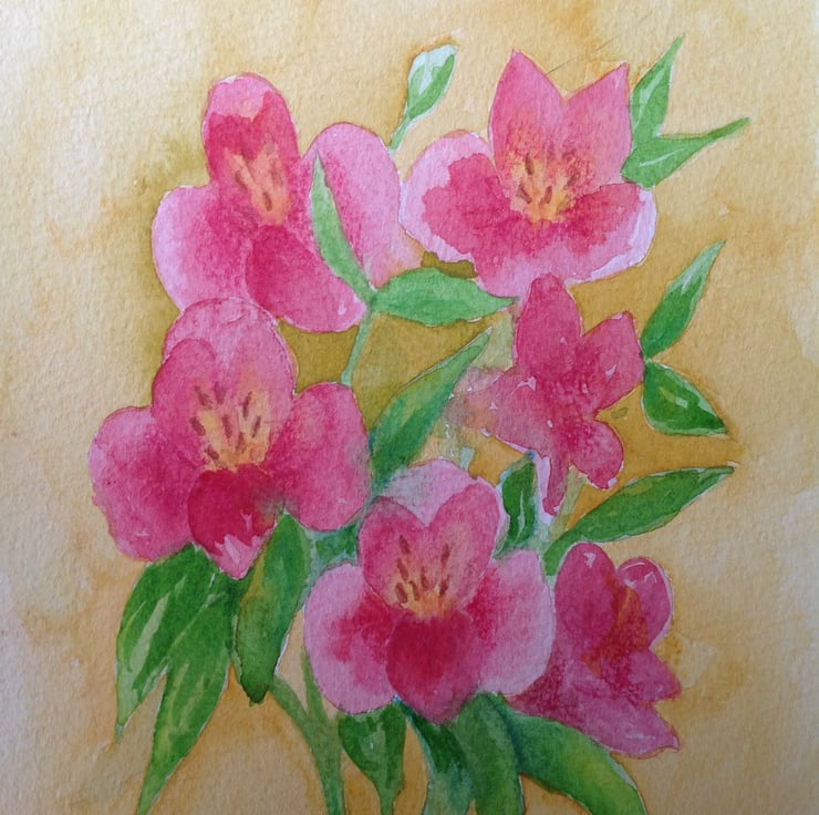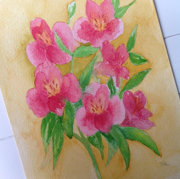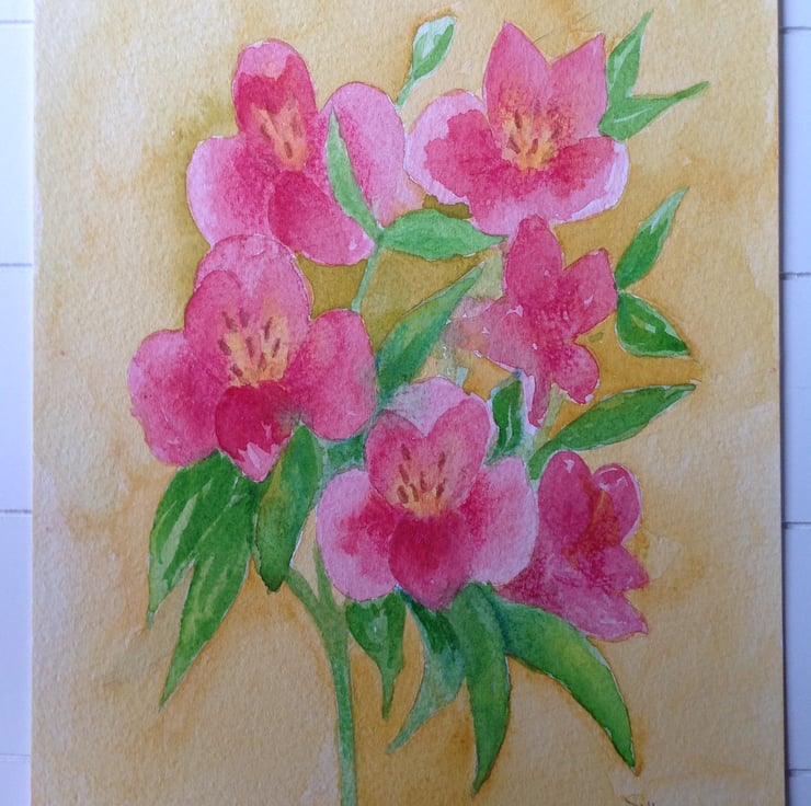 A vibrant, contemporary, original watercolour of Alstroemeria flowers. It has been painted onto watercolour paper measuring 18 x 23.5 cm (approximately 7 x 9 inches), using watercolour paints.